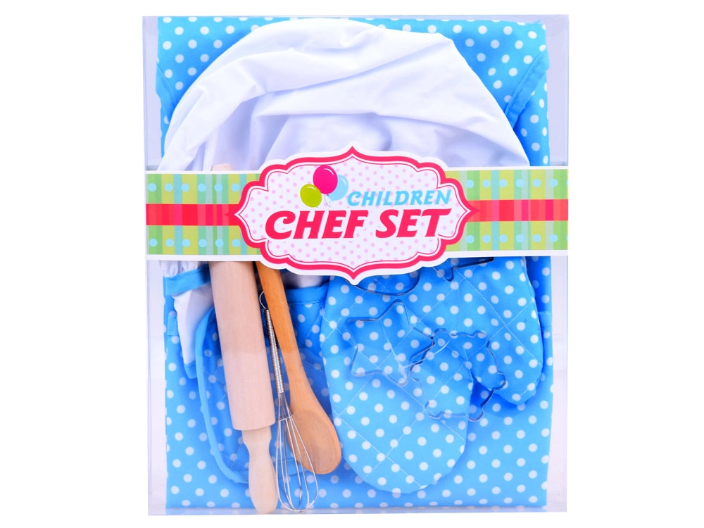 Prijuostė, kepurė, pirštinė, padėkliukas ir kepimo įrankiai vienoje pakuotėje – viskas, ko vaikui reikia smagiam ir tikram gaminimui.