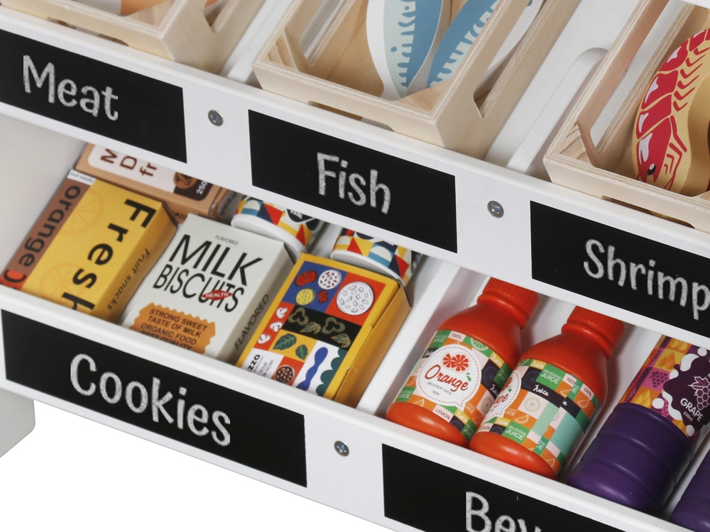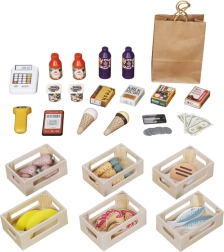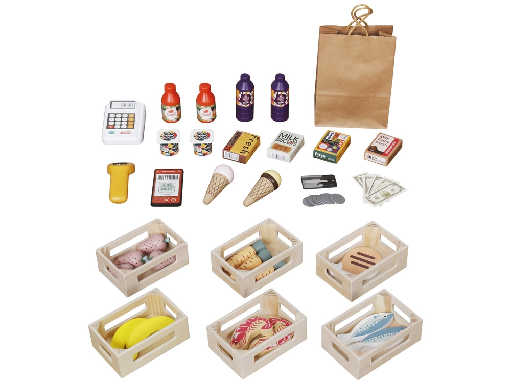 Rinkinyje yra kasa su mokėjimo terminalu, skaitytuvas, žaisliniai pinigai, medinės dėžutės su maisto produktais, popierinis maišelis, skambutis ir dekoratyviniai lipdukai. Vaikai įgis skaičiavimo, finansinio raštingumo ir bendradarbiavimo pagrindus, taip pat lavins rašymą ir skaitymą ant kreidinių lentelių.