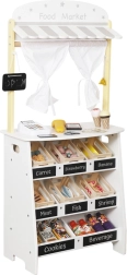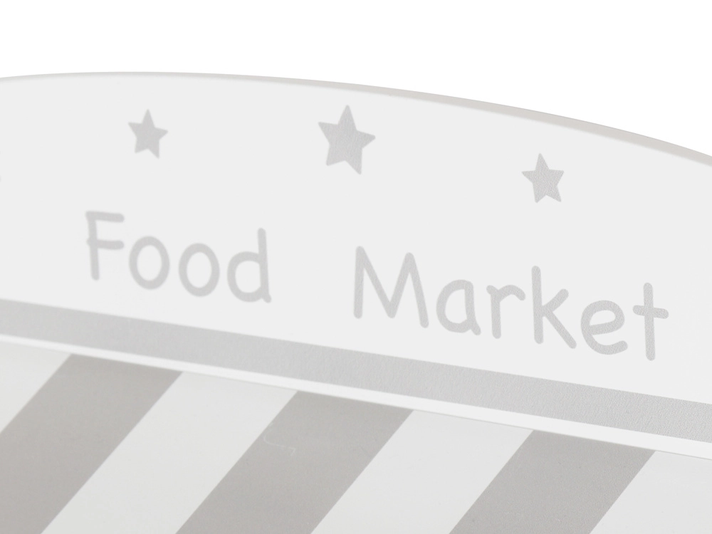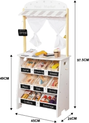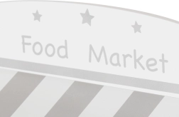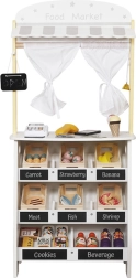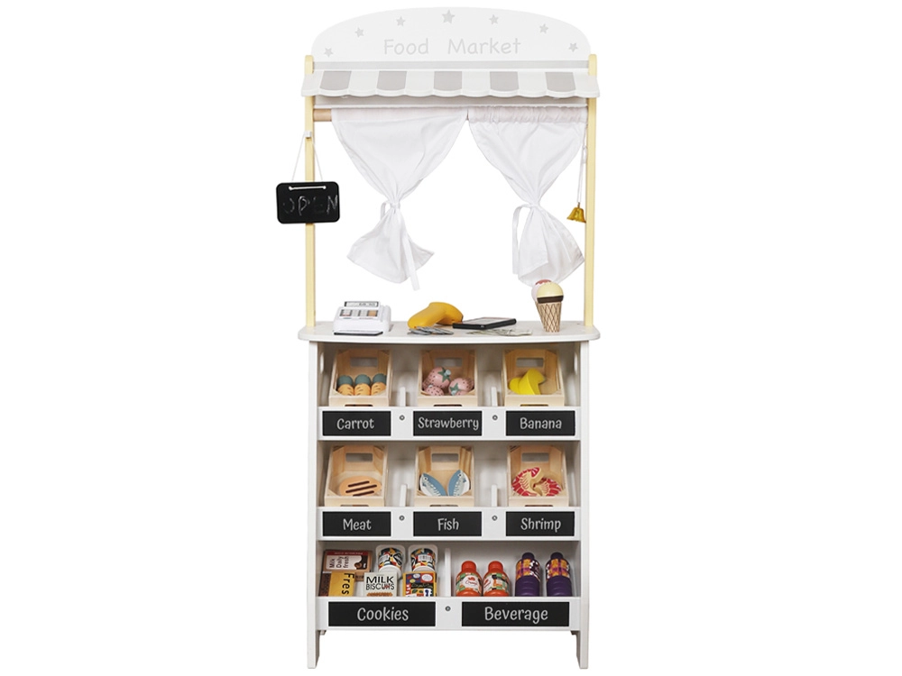 Medinis stendas su markize ir maisto skyreliais suteikia vaikams autentišką apsipirkimo patirtį: vaisių ir daržovių rūšiavimas, rašymas kreida ant lentelių ir prekių žymėjimas per kasą su skaitytuvu. Apvertus ar uždarius šonines sieneles jis virsta žaviu teatrėliu su užuolaida – idealu pirmosioms istorijoms ir pasirodymams.