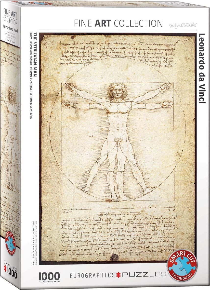 EUROGRAPHICS pristato dėlionę su garsiojo Vitruvijaus žmogaus motyvu. Tekstai ant atskirų detalių pateikti keturiomis kalbomis: anglų, prancūzų, ispanų ir vokiečių.