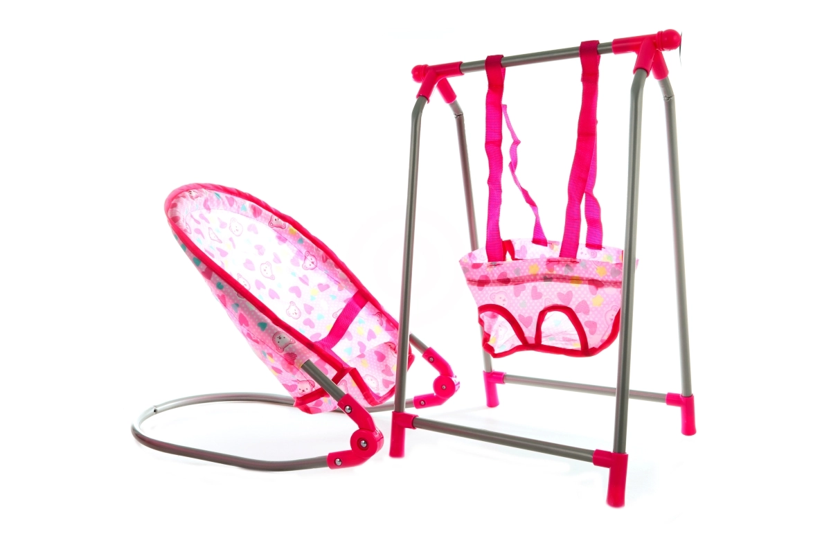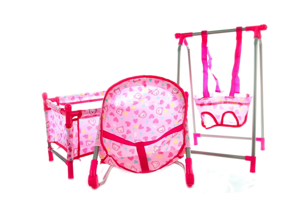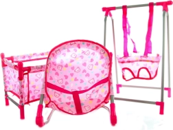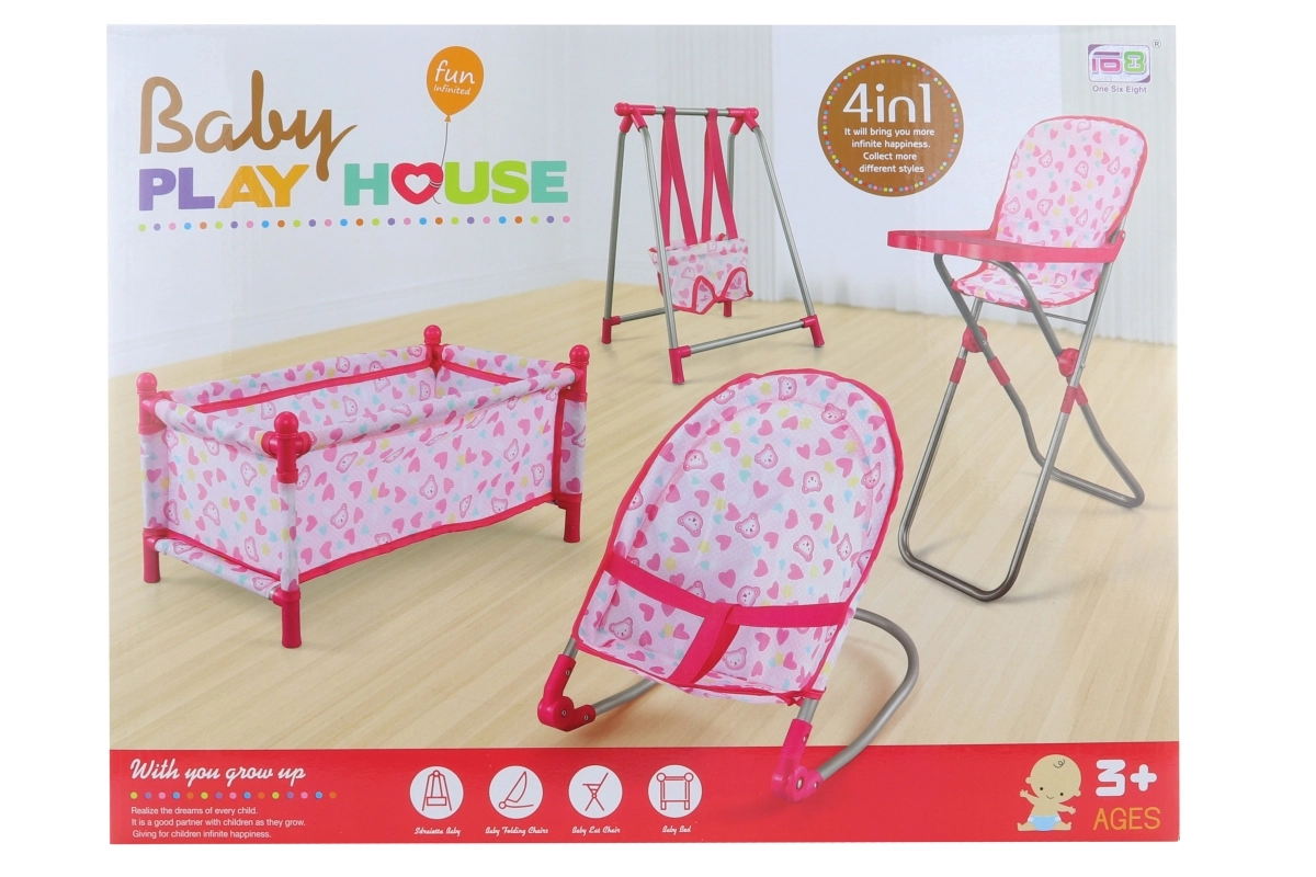 Skatinkite vaikų vaizduotę su stilingu 4 viename lėlių rinkiniu, kuriame yra lovytė, sūpynė, gultas ir maitinimo kėdutė. Švelnaus rožinio dizaino su širdelių motyvais rinkinys skirtas vaikams nuo 3 metų ir padeda lavinti vaidmenų žaidimą, rūpestingumą bei smulkiąją motoriką.