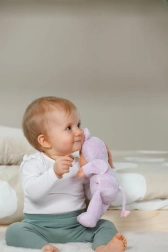 Lėlė turi minkštą vinilinę galvutę ir audininį kūnelį – puikiai tinka glaustis.