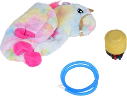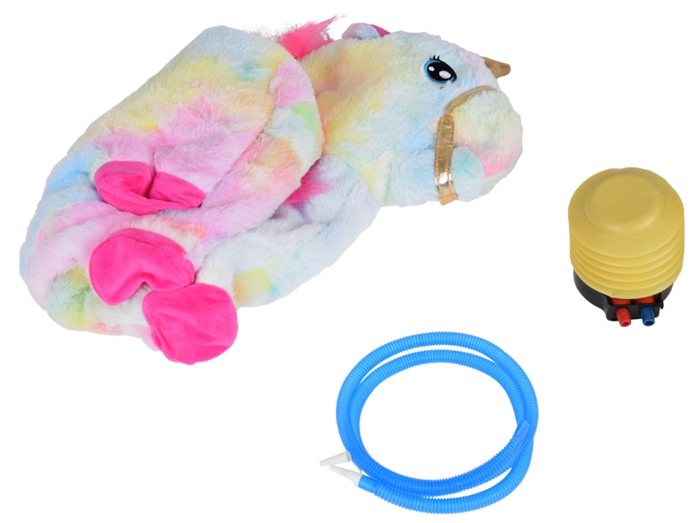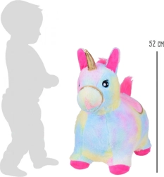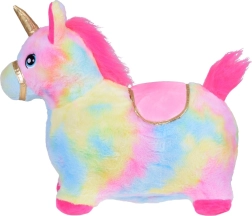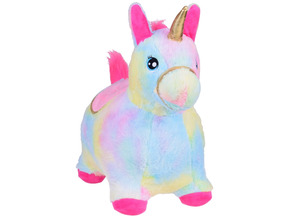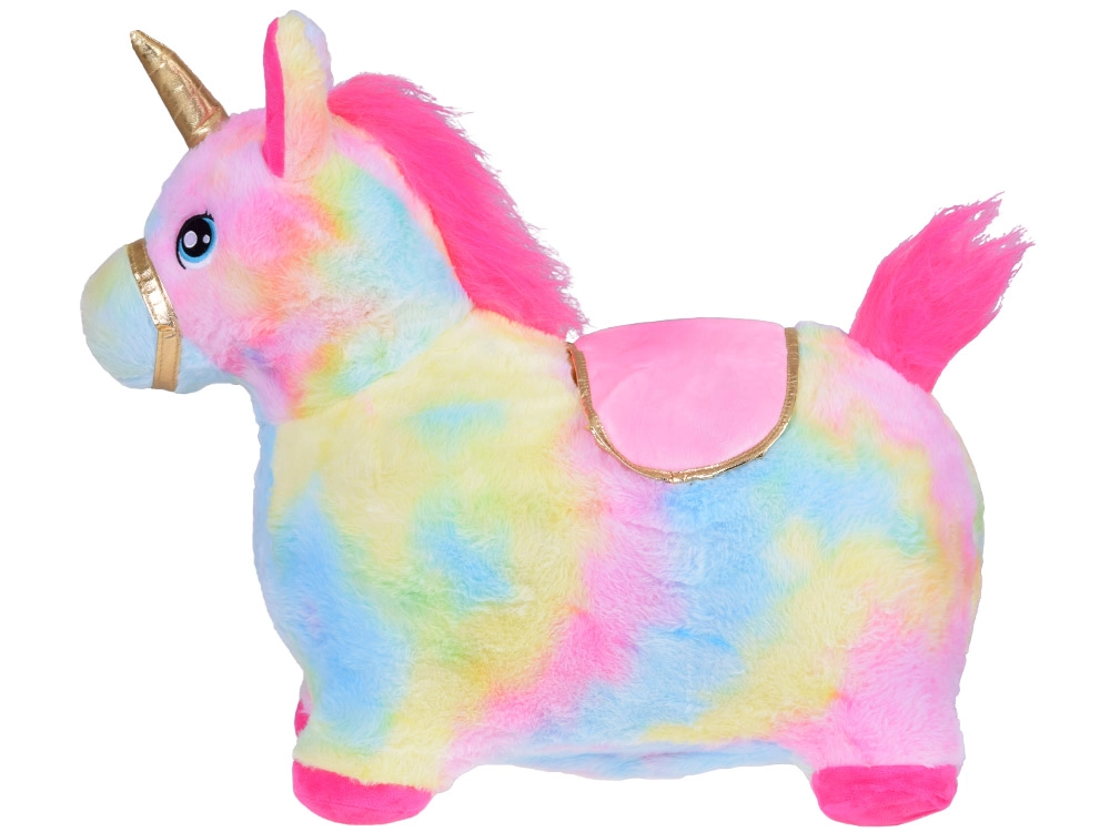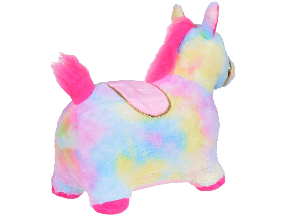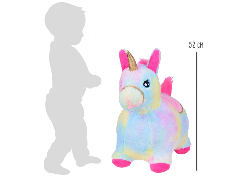 Šis šokinėjantis vienaragis sujungia patvarų pripučiamą guminį korpusą ir švelnų, malonų pliušinį užvalkalą vaivorykštės spalvų. Kruopščiai apgalvotos detalės, tokios kaip siuvinėtos akys, auksinė apynasrė, minkštas audinio balnelis su auksine kantavimu ir rožinė karčiai su uodega, patiks vaikams. Tarp ausų paslėptas švilpukas, kuris dar labiau pagyvina kiekvieną šuoliuką.
