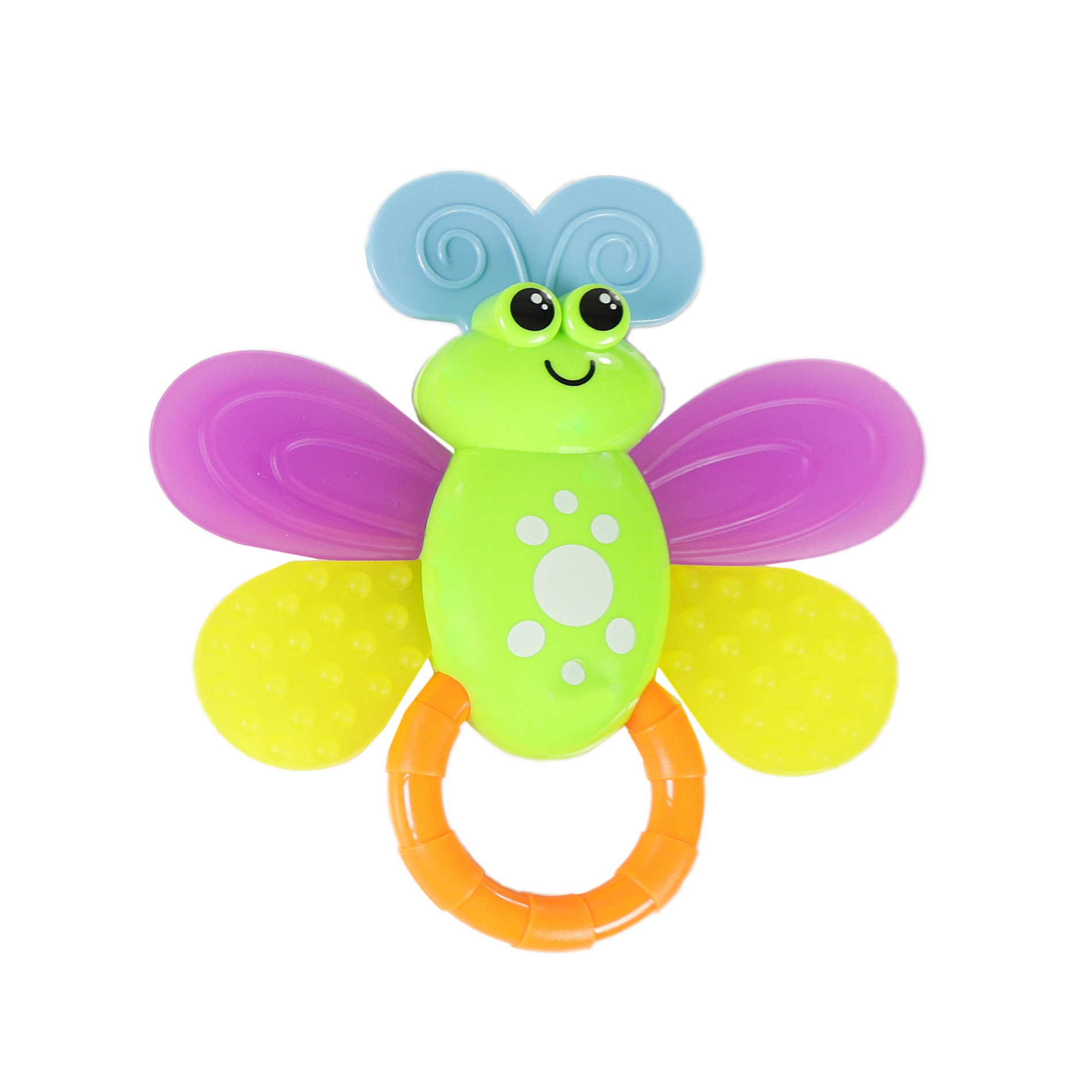 Drugelio forma ir ryškios šio barškučio spalvos suteikia vizualinį malonumą. Patogi rankenėlė ir įvairios tekstūros paverčia jį puikiu žaislu mažiesiems tyrinėtojams.