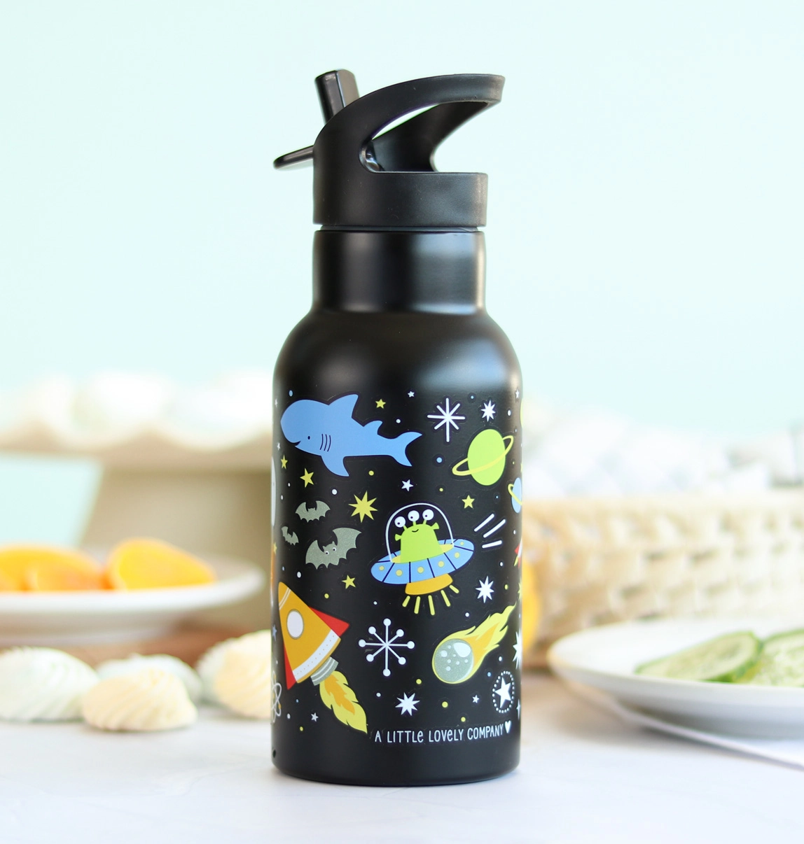 Nerūdijančio plieno korpusas atsparus kasdieniam naudojimui, o spalvota planetų ir raketų spauda pradžiugins vaikus.