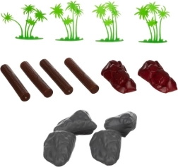 Rinkinyje yra 14 elementų (akmenys, uolos, palmės, rąstai), su kuriais vaikai sukurs fermą, safarį ir mišką, lavins fantaziją ir pasakojimą.