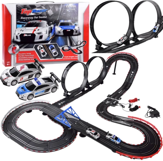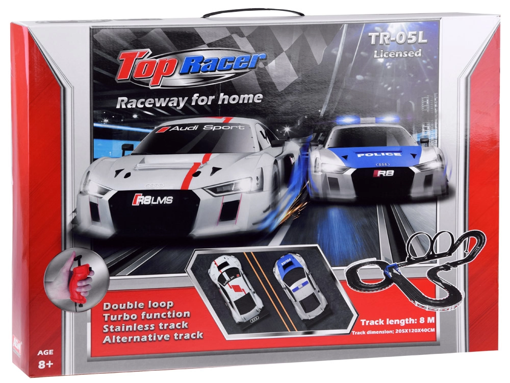 8 metrų ilgio elektrinė automobilių trasa suteikia dinamiškas namų lenktynes su dviem licencijuotais AUDI automobiliais, dviguba kilpa, aštriais posūkiais ir sklandžiu greičio valdymu per laidinius valdiklius. Maitinimas iš tinklo užtikrina stabilų našumą be baterijų ir ilgas pramogų valandas mažiems ir dideliems automobilių sporto gerbėjams.