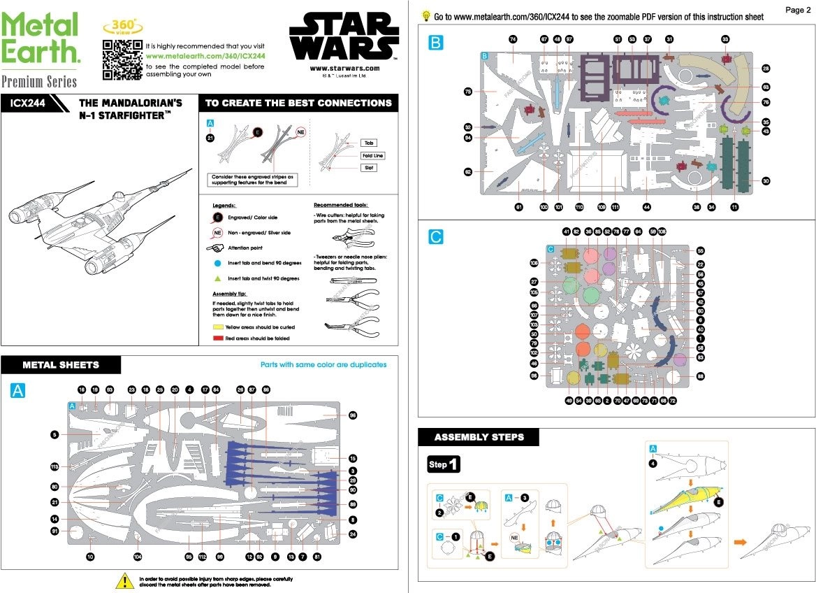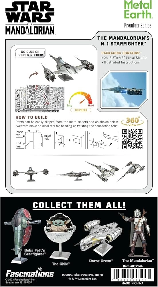 Šis premium rinkinys leidžia MANDALORIAN gerbėjams ir modeliuotojams pastatyti tikslią legendinio N‑1 Starfighter kopiją. Iš kvadratinių plieninių lakštų išformuosite ir sujungsite detales į įspūdingą metalinį modelį su subtiliu lazeriniu raižymu, ištikimai atkartojančiu originalią laivo išvaizdą.