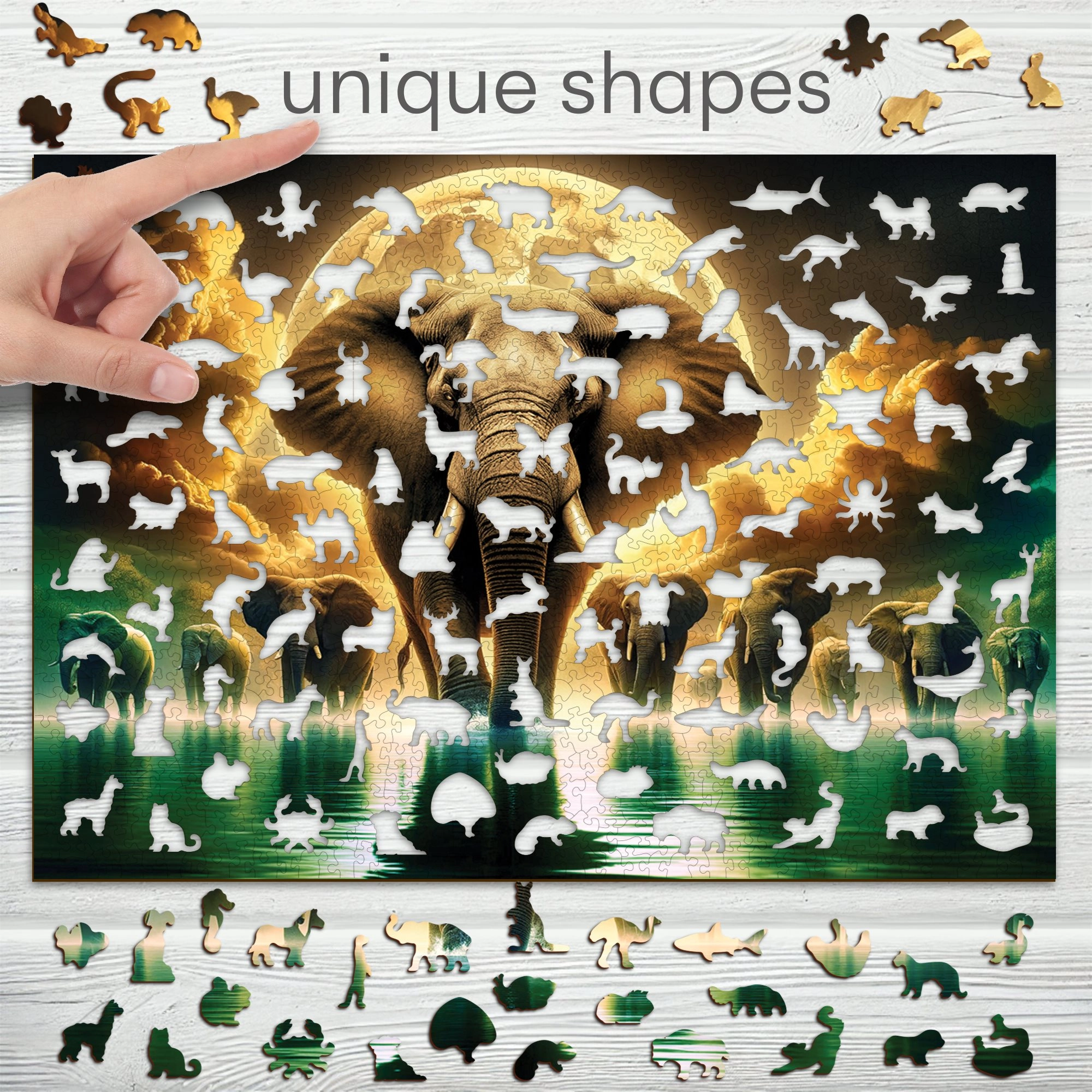Įženkite į fantazijos pasaulį su medine WOODEN CITY dėlione – Dramblių sapnai. Dėl tikslaus lazerinio pjovimo detalės turi lygias, atplaišų neturinčias briaunas, o atrinktos gyvūnų formos dalys papildomai praturtina motyvą subtiliomis detalėmis. Šias specialias detales galima pastatyti atskirai kaip mažas figūrėles, todėl dėlionė yra ne tik pramoga, bet ir kolekcinis kūrinys.