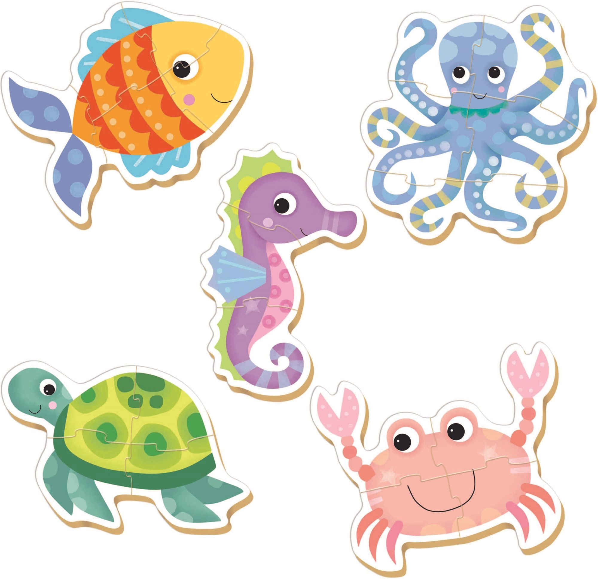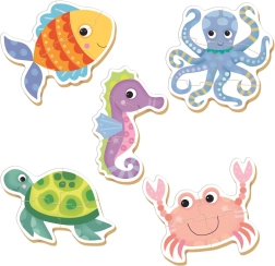 Dėliokite žuvelę, aštuonkojį, arkliuką, vėžlį ir krabą – kiekvienas paveikslėlis turi skirtingą detalių skaičių, todėl vaikai natūraliai juda nuo paprastesnių prie sudėtingesnių. Detalės tvirtos, patogiai laikomos, o ryškios spalvos ir formos kviečia žaisti.