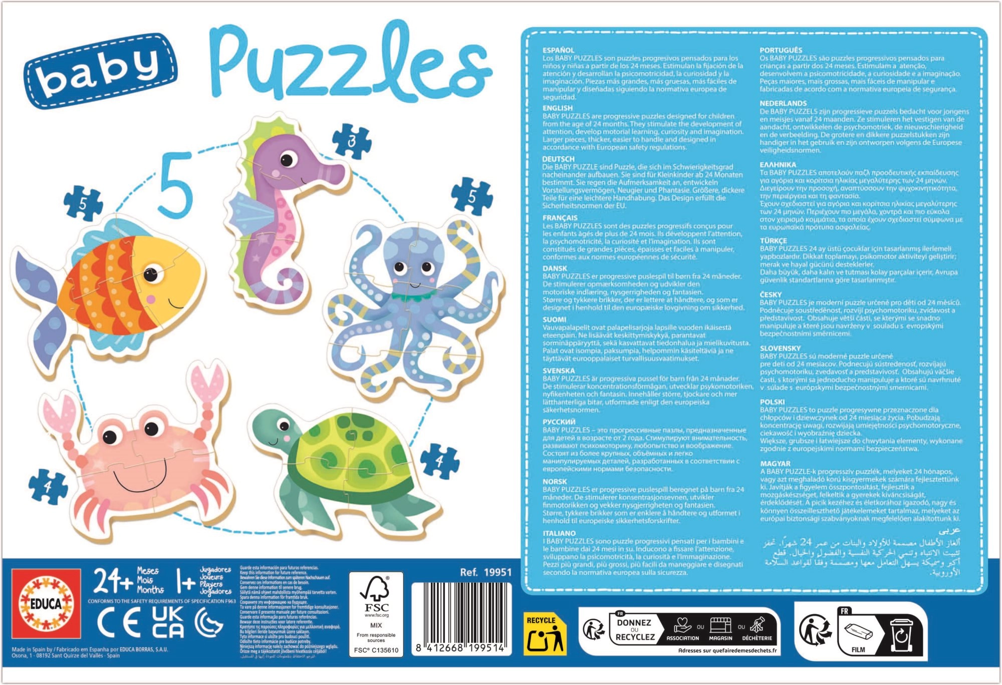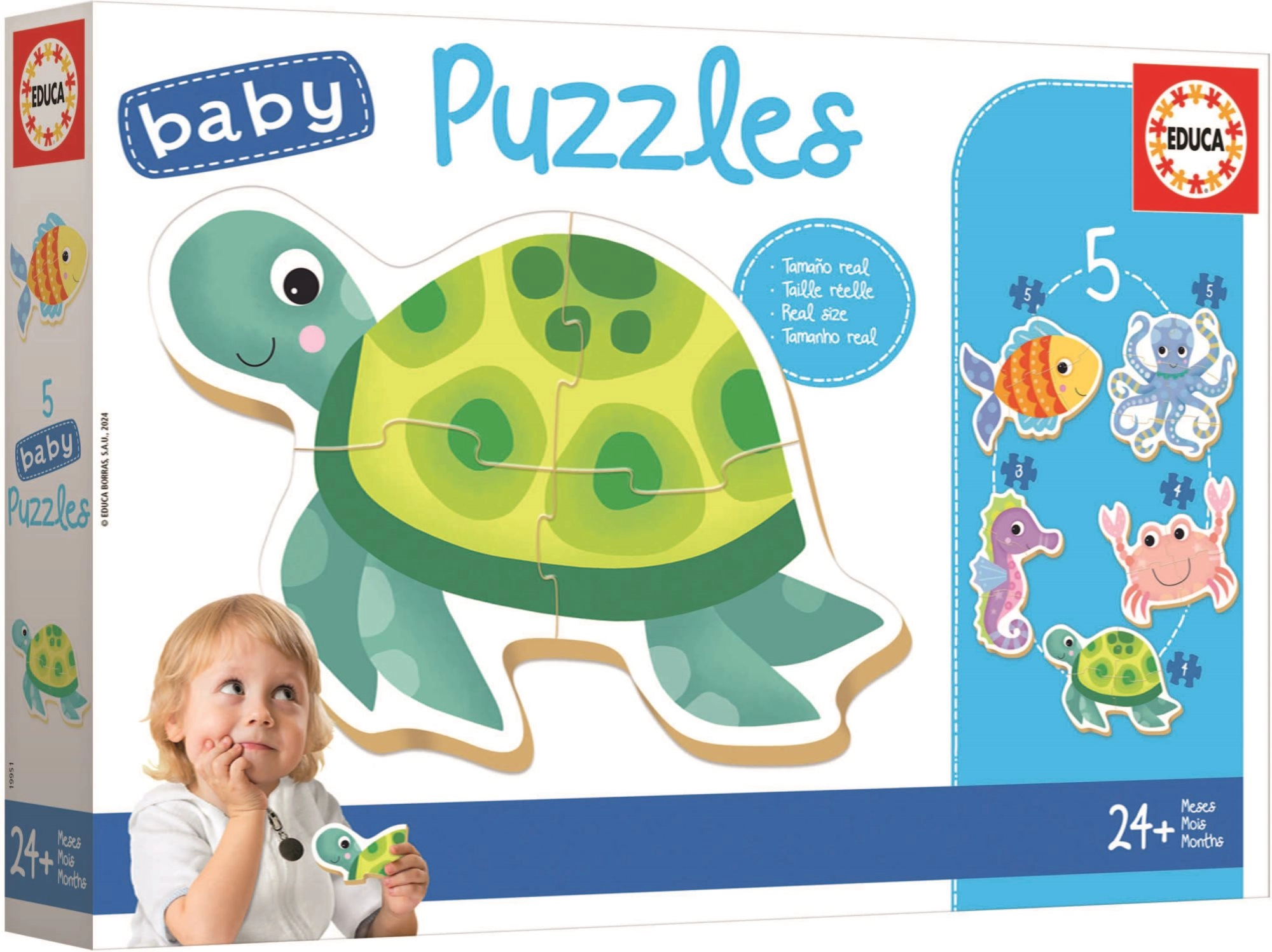 EDUCA Vandens gyvūnai 5v1 kūdikių dėlionės sukurtos specialiai patiems mažiausiems. Jos skatina psichomotorinę raidą, akių–rankų koordinaciją bei kantrybę ir loginį mąstymą. Sudėlioto paveikslėlio dydis apie 15 × 15 cm – idealiai tinka mažoms rankoms ir pirmai sėkmei.