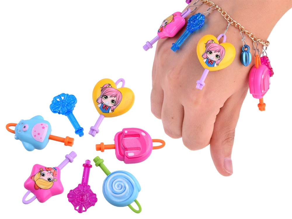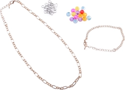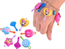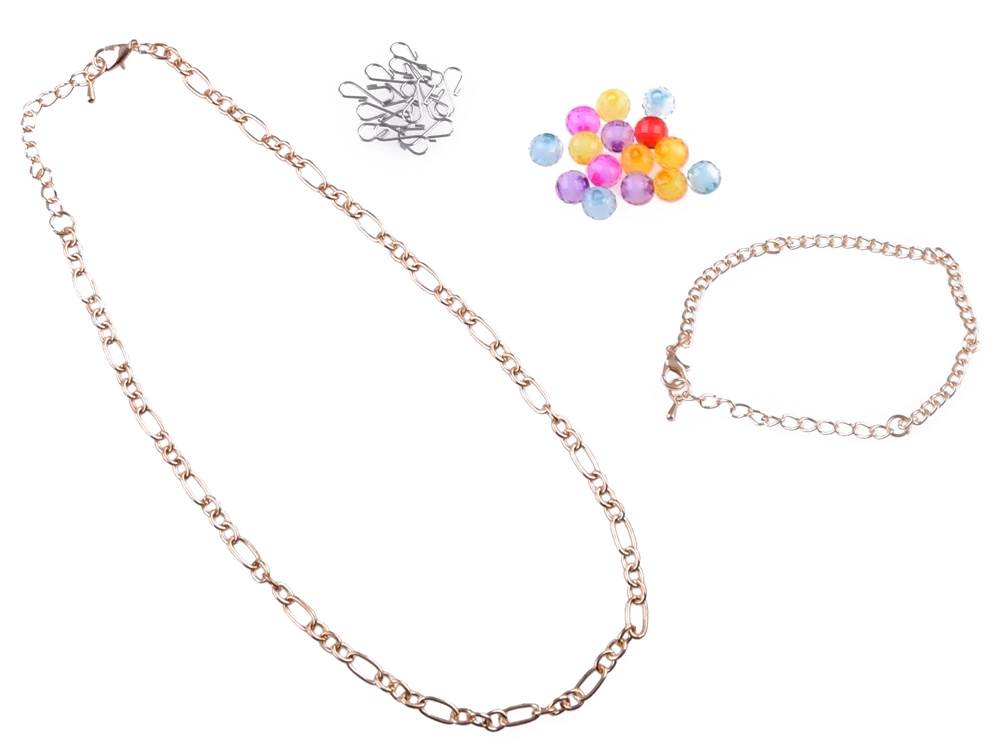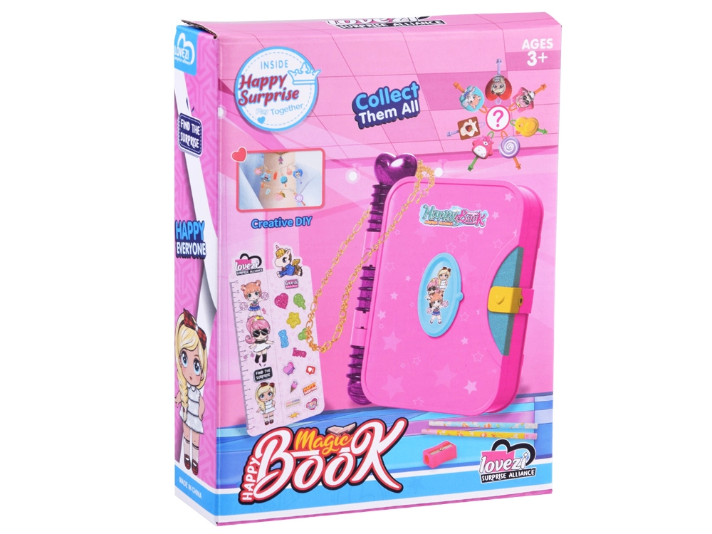 Rinkinyje yra užrašų knygelė, lipdukai, pieštukas ir drožtukas bei karoliukai, grandinėlės ir pakabukai savo apyrankių kūrimui.