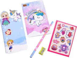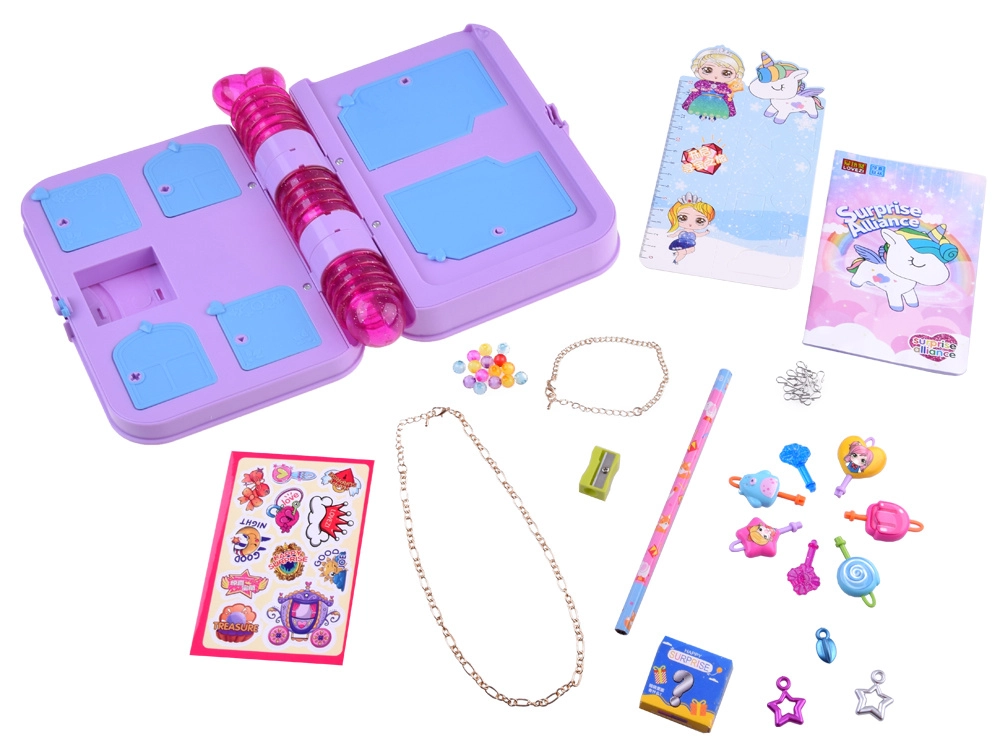 - 7 rakteliai; pieštukas; drožtukas; grandinėlė; 2 pakabukai apyrankėms; spalvoti karoliukai; grandinėlė apyrankei; dekoracija – sulankstoma širdelė; kabliukai; pakabukai; lipdukai; užrašų knygelė; kartoninė liniuotė su princese; skirtukas su vienaragiu