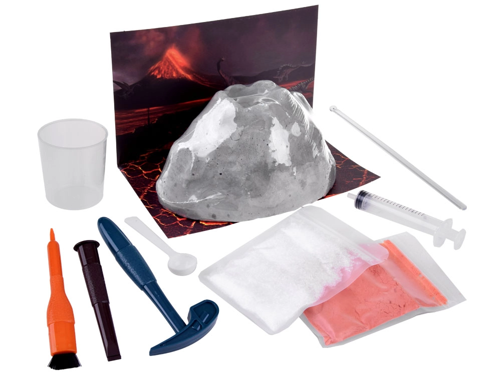 Komplekte yra lietas ugnikalnio modelis, mišinių cheminėms reakcijoms (citrinos rūgštis ir natrio vandenilio karbonatas), praktiški įrankiai kasinėjimams ir radinių valymui bei iliustruotas vadovas. Krateryje įvyksta realistiška „lavos“ reakcija, o ugnikalnio viduje vaikus laukia spalvoti mineralai ir surenkamas dinozauro skeletas.