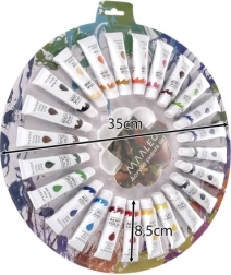 Pilnas akrilinių dažų rinkinys su palete tiek pradedantiesiems, tiek pažengusiems. Sudėtyje yra 24 atspalviai po 12 ml su ryškiais pigmentais, didele dengiamąja geba ir greitu džiūvimu. Dažai lengvai maišomi, skiedžiami vandeniu ir išdžiūvę sudaro patvarią, vandeniui atsparią plėvelę. Tinka drobei, popieriui, medžiui, keramikai ir tekstilei.