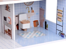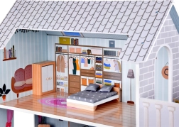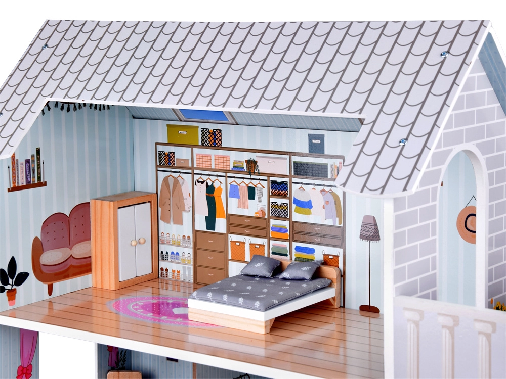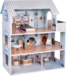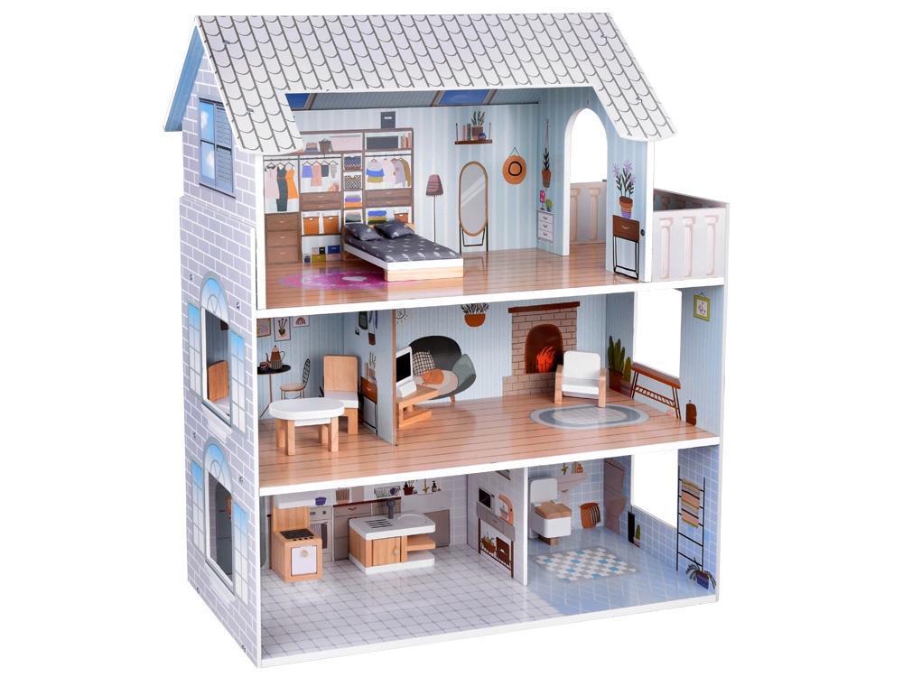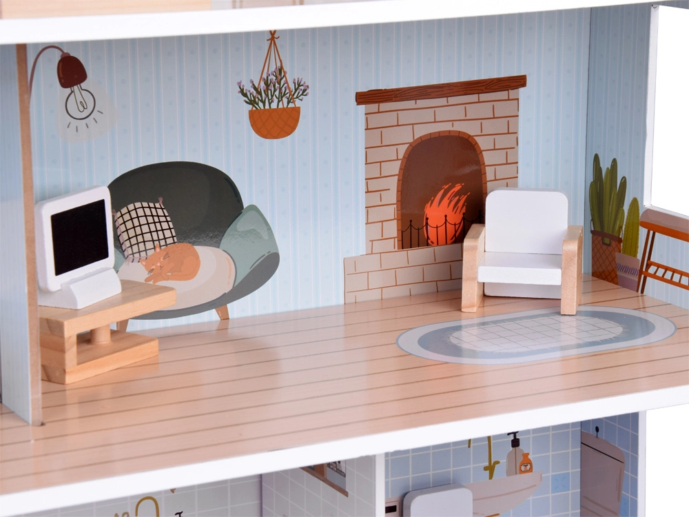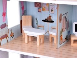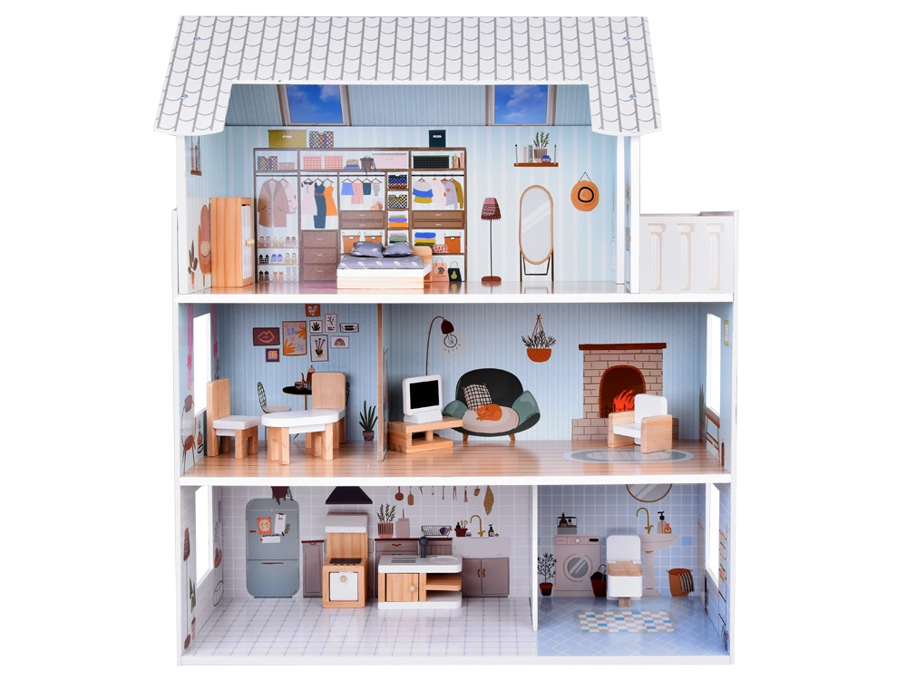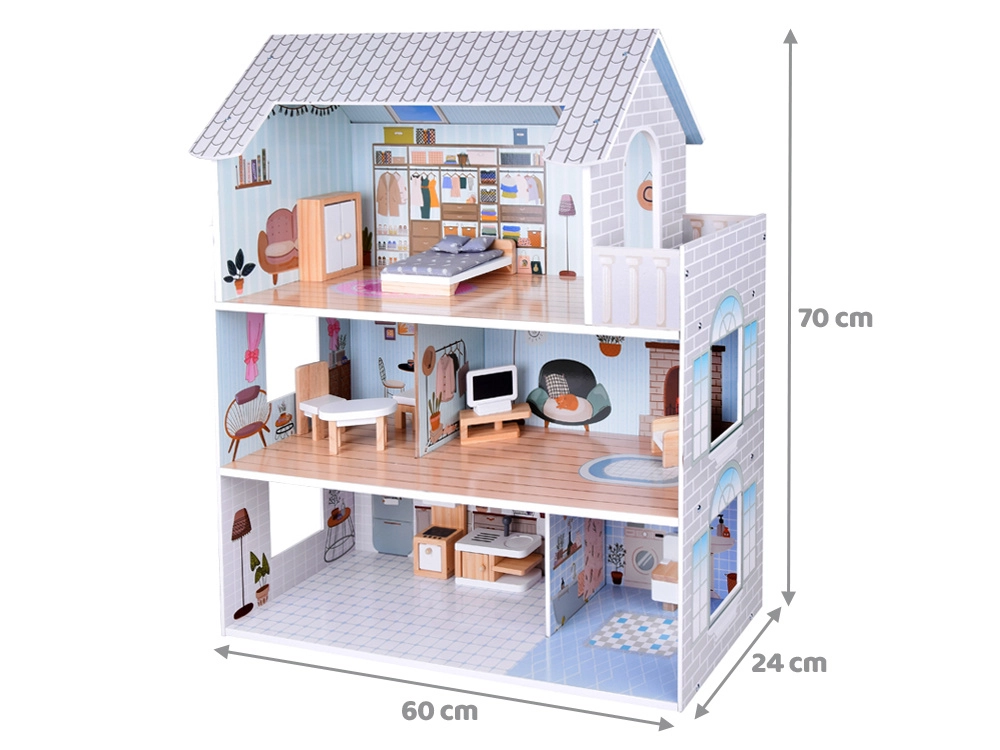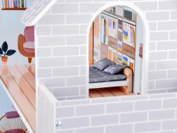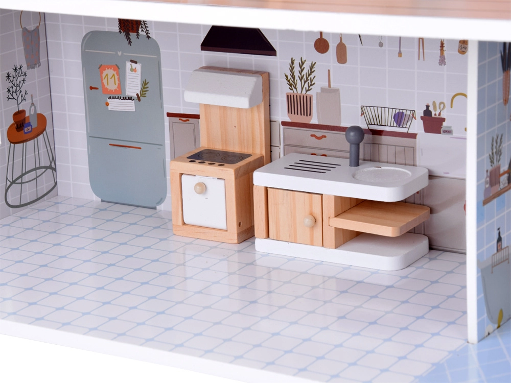 Ši stilinga medinė lėlių vila siūlo tris aukštus pramogų ir daug erdvės fantazijai. Vaikai atras virtuvę, vonios kambarį, svetainę, valgomąjį ir erdvų miegamąjį su balkonu. Realistiški tapetai, grindys ir smulkios dekoracijos pastelinių spalvų gama kuria jaukią atmosferą begalinėms istorijoms.