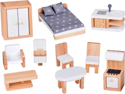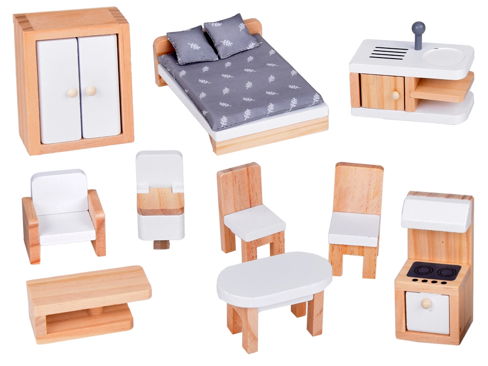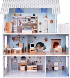 Rinkinyje yra gausus baldų komplektas, kurio dėka lengva išdėstyti atskirus kambarius. Konstrukcija iš patvarios medienos, lygūs kraštai ir netoksiškos medžiagos užtikrina saugų žaidimą. Surinkimas greitas ir intuityvus – detalės sunumeruotos, o iliustruotas vadovas veda žingsnis po žingsnio.