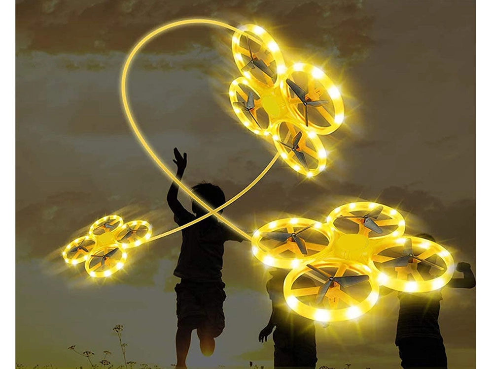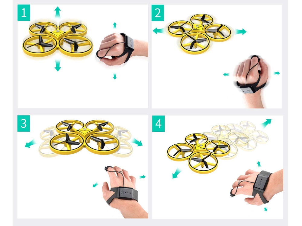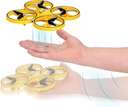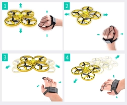 Smagus mini dronas, valdomas gestais su patogiu apyrankiniu valdikliu, siūlo paprastą valdymą ranka, automatinį kybojimą, 360° apsivertimus ir infraraudonųjų spindulių kliūčių vengimą. Dėl lengvo ir patvaraus rėmo su sraigtų apsaugomis, LED apšvietimo ir USB įkrovimo idealiai tinka vaikams ir suaugusiesiems – skrydžio trukmė iki 8 minučių, veikimo nuotolis 10–20 m.
