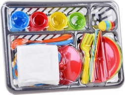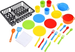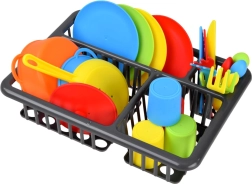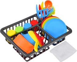 Pakuotėje yra viskas, ko reikia mažiesiems virėjams: nuo puodo su dangčiu ir keptuvės iki woko, lėkščių, puodelių ir stalo įrankių keturiems. Praktiška džiovykla padeda palaikyti tvarką.