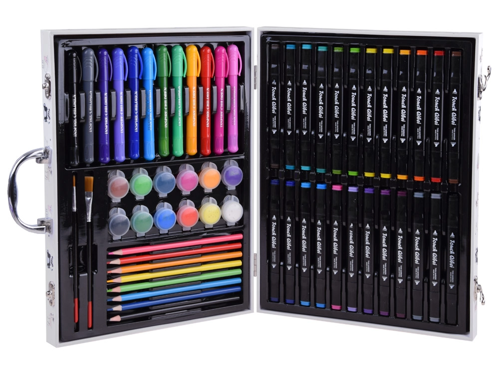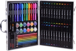 Rinkinys derina pieštukus, akvarelinius dažus, storus ir plonus flomasterius bei teptukus – idealiai tinka piešimui, spalvinimui ir tapybai.