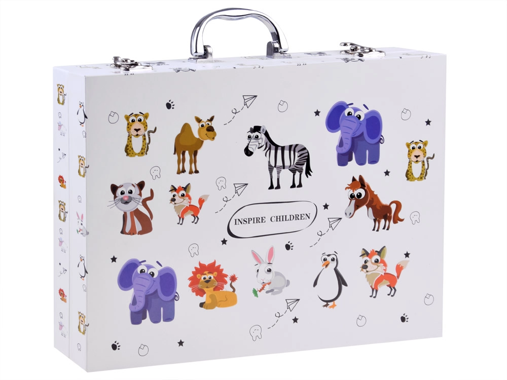 Šis gausiai sukomplektuotas rinkinys mažiesiems menininkams suteikia viską, ko reikia piešimui ir tapybai. Kompaktiškas lagaminėlis su linksmomis gyvūnėlių iliustracijomis lengvai nešiojamas dėl tvirtos rankenos, tad kūryba visada po ranka – namuose, išvykose ir mokykloje.