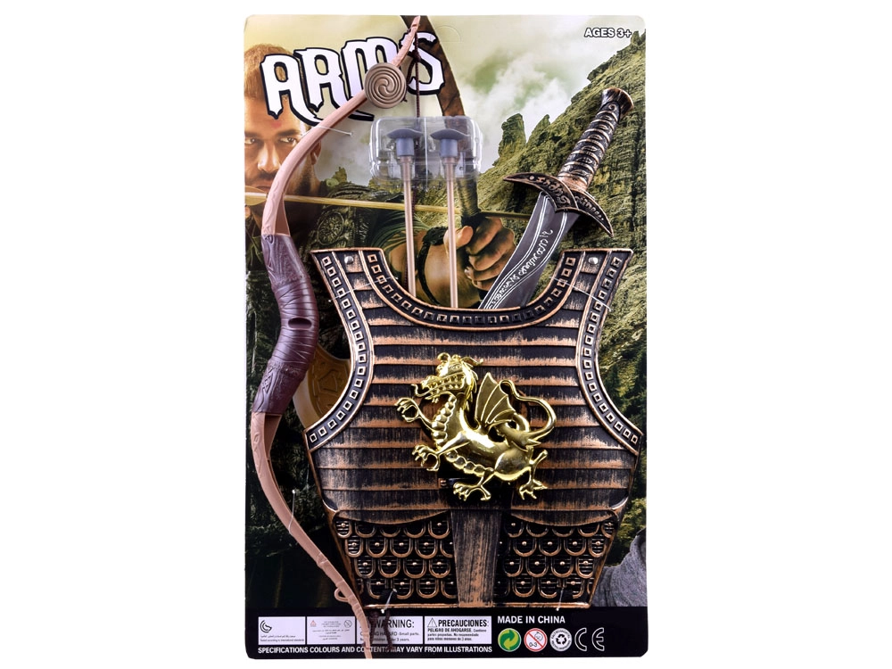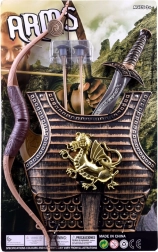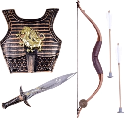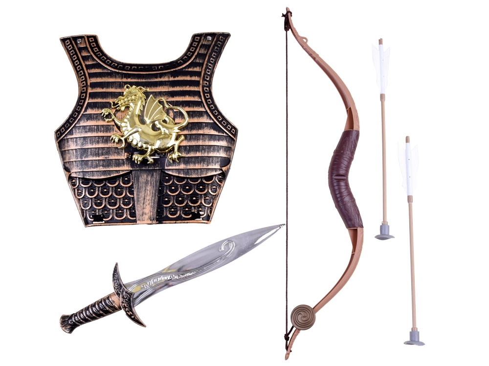 Rinkinyje yra šarvai, lankas, dvi strėlės ir kardas – idealus derinys fantazijos mūšiams ir karnavaliniams kostiumams.
