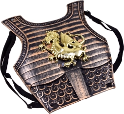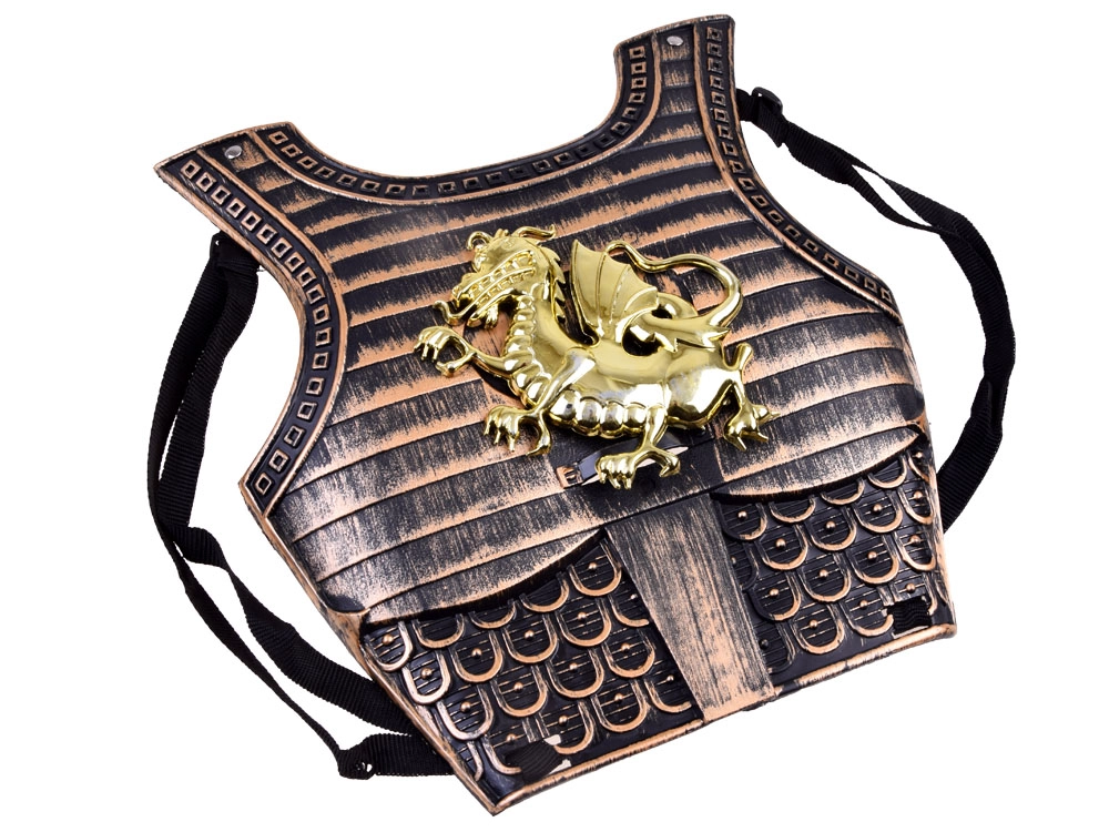Ši pilna riterio įranga puikiai tinka namų nuotykiams, karnavalui ir vaikų šventėms. Šarvai su ryškiu auksiniu drakonu patogiai priglunda dėka reguliuojamų dirželių, lankas su dviem saugiomis siurbtukinėmis strėlėmis pradžiugins mažuosius šaulius, o lengvas kardas papildys kiekvieną herojinę išvyką.