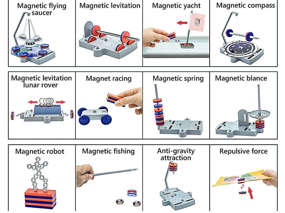 Rinkinyje rasite spalvotus magnetus, plastikines bazes ir priedus, su kuriais galima kurti teminius projektus – pavyzdžiui, švytuoklinį NSO, magnetinį vežimėlį ar figūrėlę iš metalinių veržlių. Dėl aiškių detalių surinkimas yra paprastas ir saugus – puikiai tinka mokymuisi namuose ir būreliuose.
