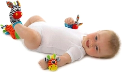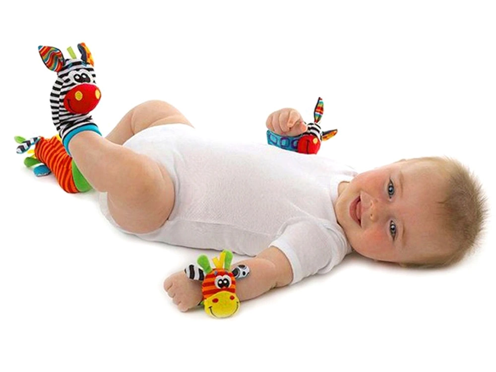 Barškančios kojinytės ir dirželiai skatina spardytis ir mosikuoti rankytėmis, taip natūraliai lavinant motoriką ir judesių koordinaciją.
