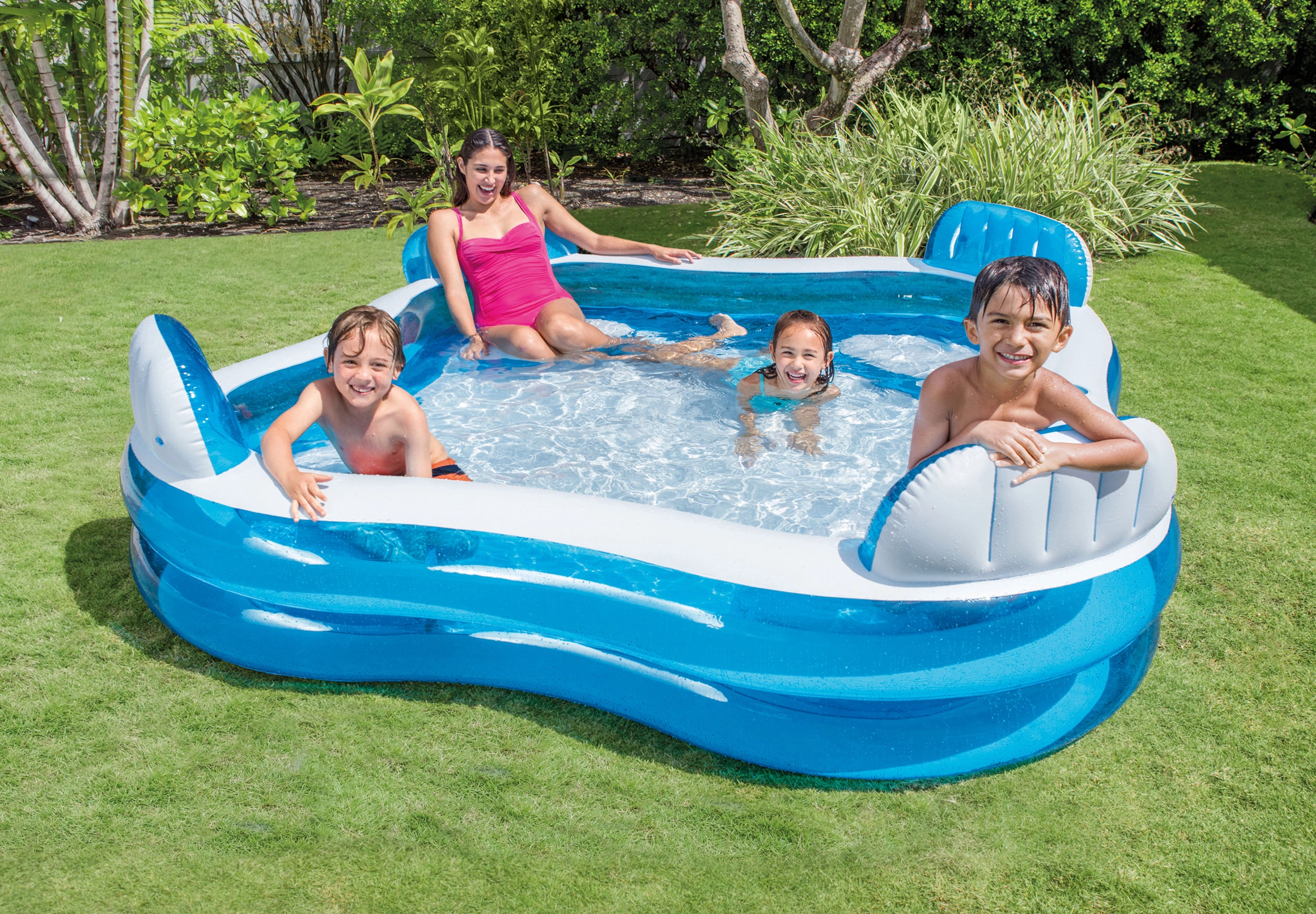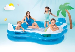 Mėgaukitės vasara su erdviu pripučiamu baseinu, kuris kampuose turi 4 integruotas sėdynes su atlošais maksimaliam patogumui. Patvarios PVC medžiagos, stabili konstrukcija su 2 oro kameromis ir apgalvotos detalės daro jį idealiu sprendimu sodui, terasai ar atostogoms.