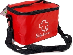 Praktiškas tekstilinės medžiagos krepšys per petį su užrašu „Baby Doctor“ laiko visus įrankius tvarkingai ir puikiai tinka kelionėms bei žaidimams namuose. Gydytojo vaidmenų žaidimai natūraliai mažina stresą prieš tikrą vizitą pas gydytoją ir paverčia jį teigiama patirtimi.