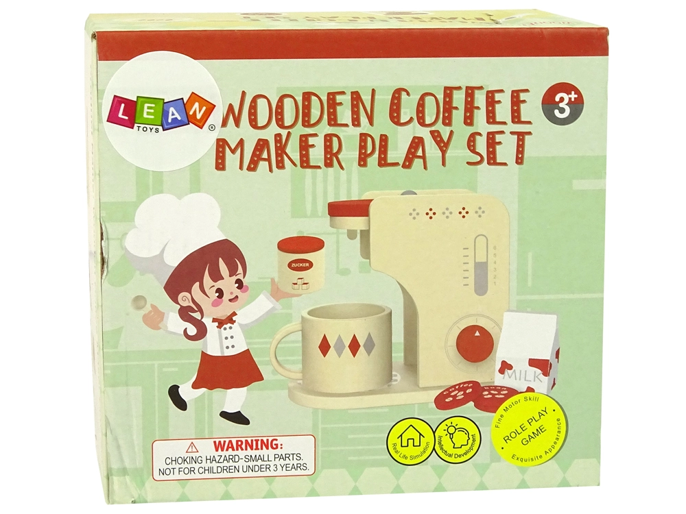 Mielas medinis kavos aparatas vaikams įneša į kiekvieną vaikišką virtuvėlę realistiško gaminimo žaidimą. Rinkinyje yra kavos aparatas su pasukamu ratuku, puodelis, pienas, cukrus ir 3 kavos kapsulės nesibaigiantiems kavinės scenarijams. Patvari medinė konstrukcija skatina smulkiąją motoriką, kūrybiškumą ir socialinius įgūdžius saugiam ir linksmam žaidimui.