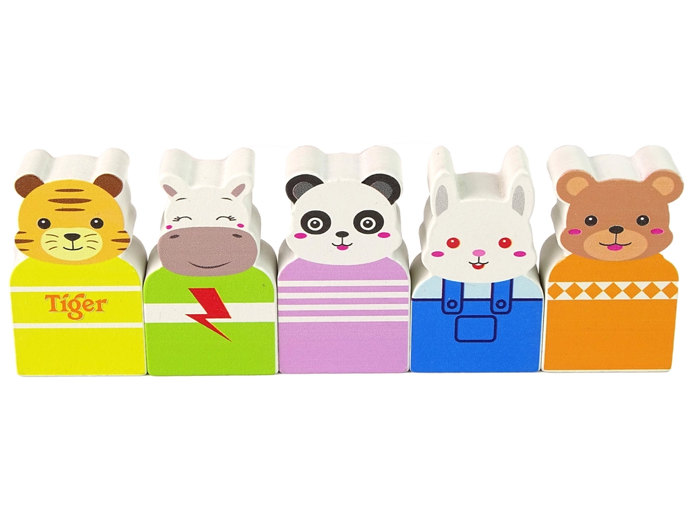 Penki personažai (panda, tigras, triušis, meška, begemotas) ir skaičiai ant gondolų skatina linksmai mokytis spalvų ir pirmųjų skaičių.