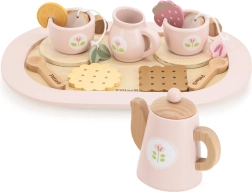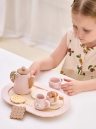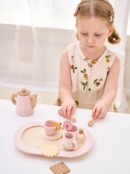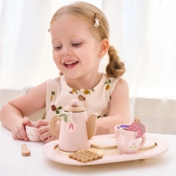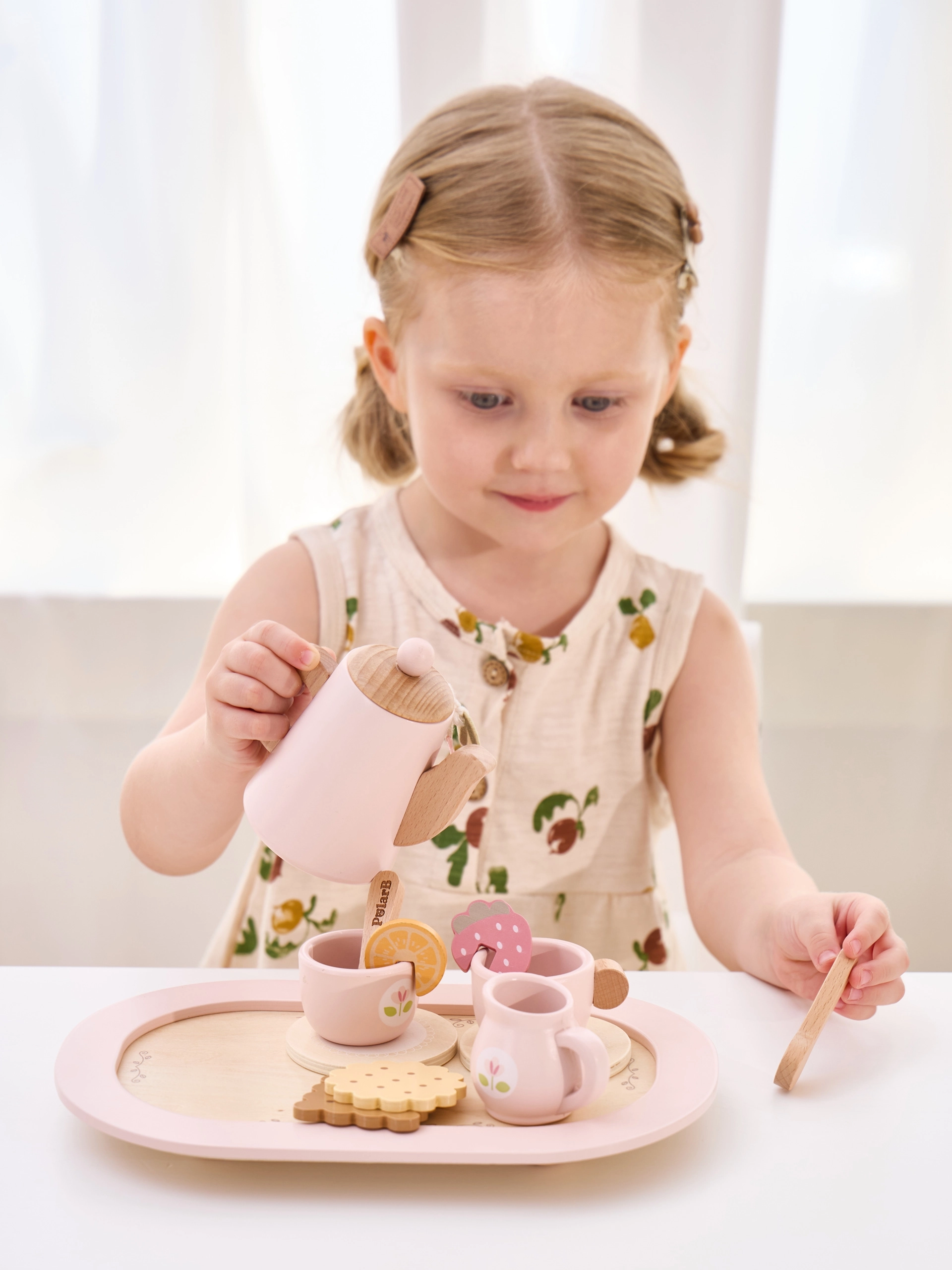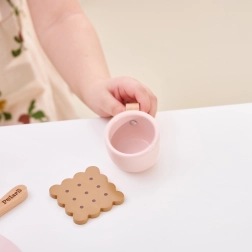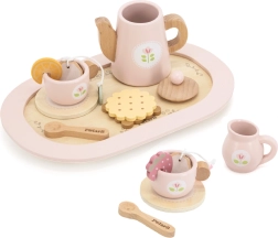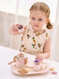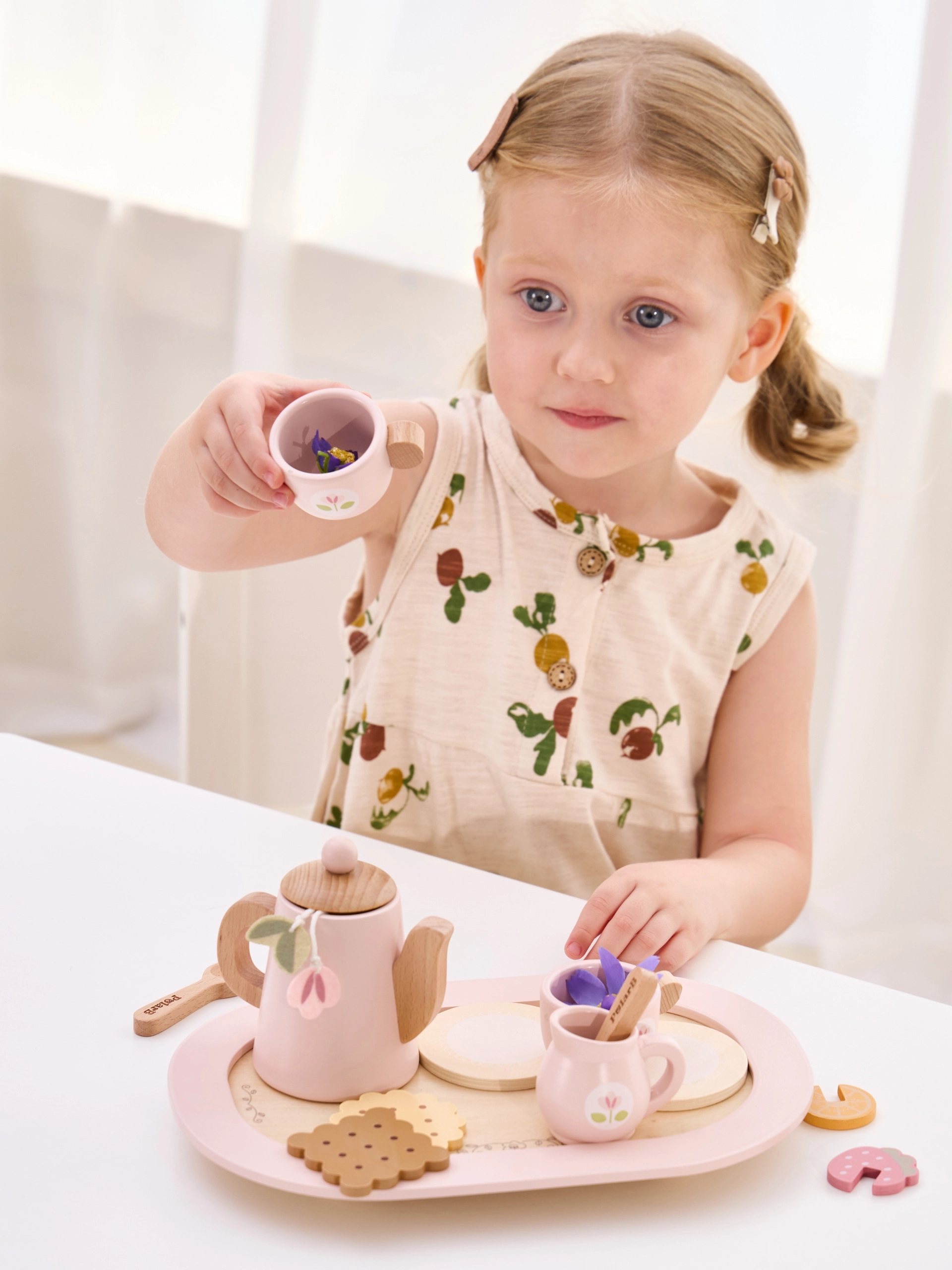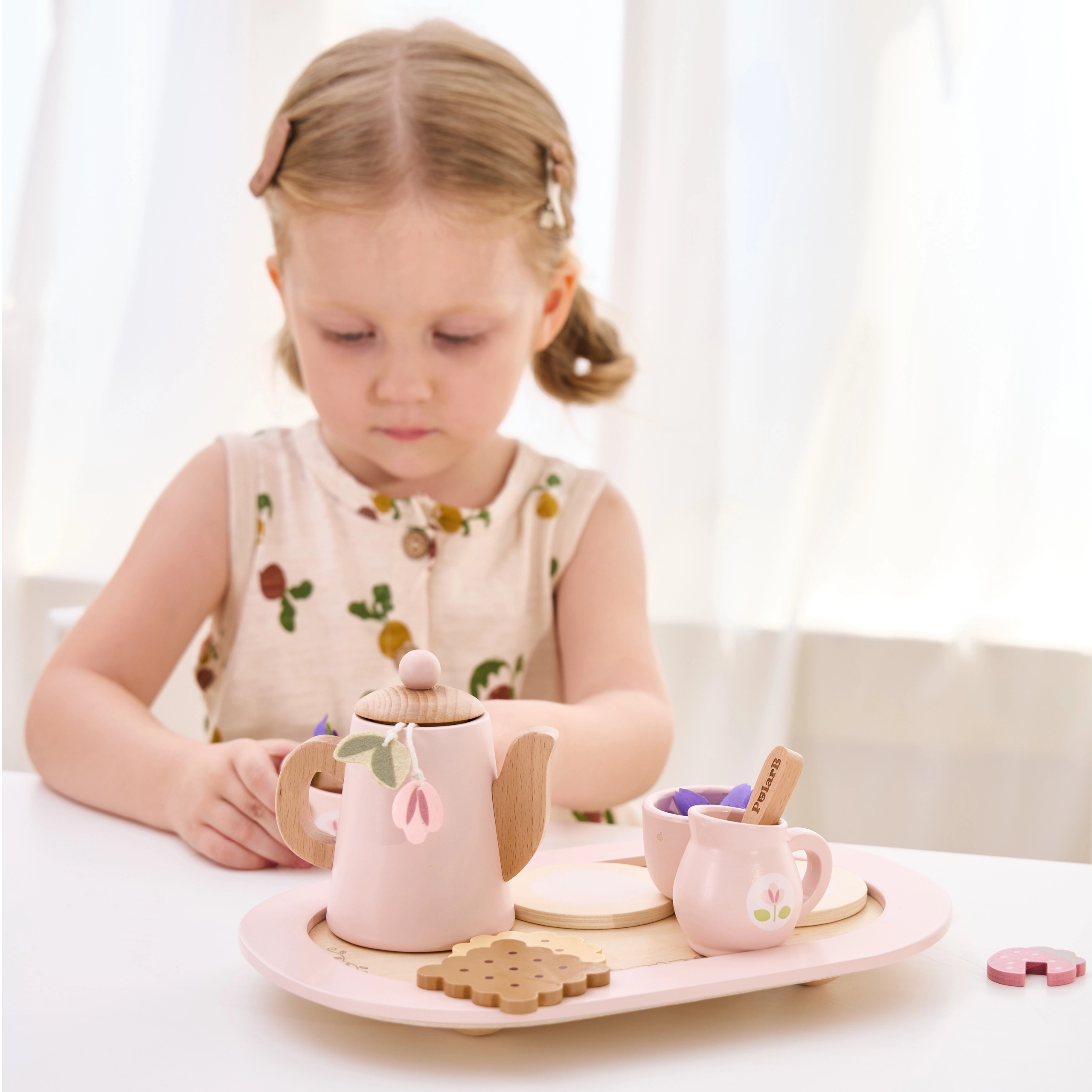 Rinkinyje yra viskas, ko reikia serviravimui: arbatinukas su dangteliu, puodeliai su lėkštutėmis, pieno ąsotėlis, šaukšteliai, arbatos maišeliai, vaisių riekelės ir kvapnūs „sausainiai“ – visa tai ant praktiško padėklo. Dėl detalių sudėties tai puikus papildymas vaikų kambariui Montessori dvasia ir taip pat graži dovana, kuri pradžiugins kiekvieną mažą šeimininką.