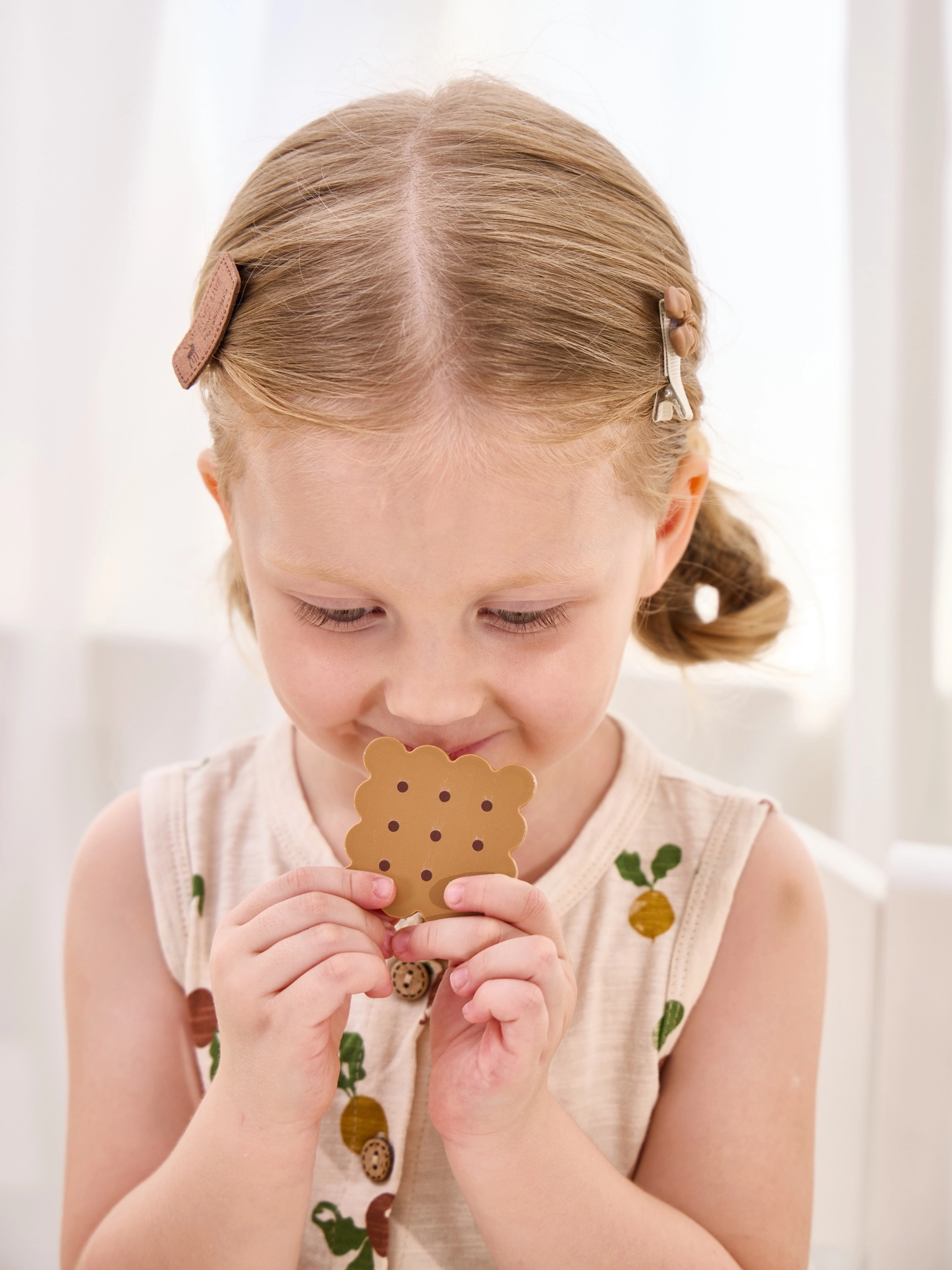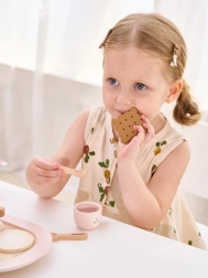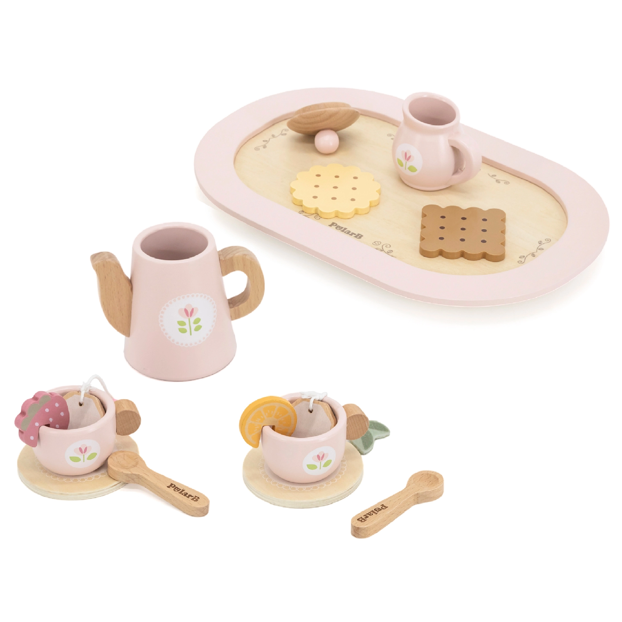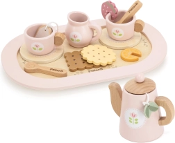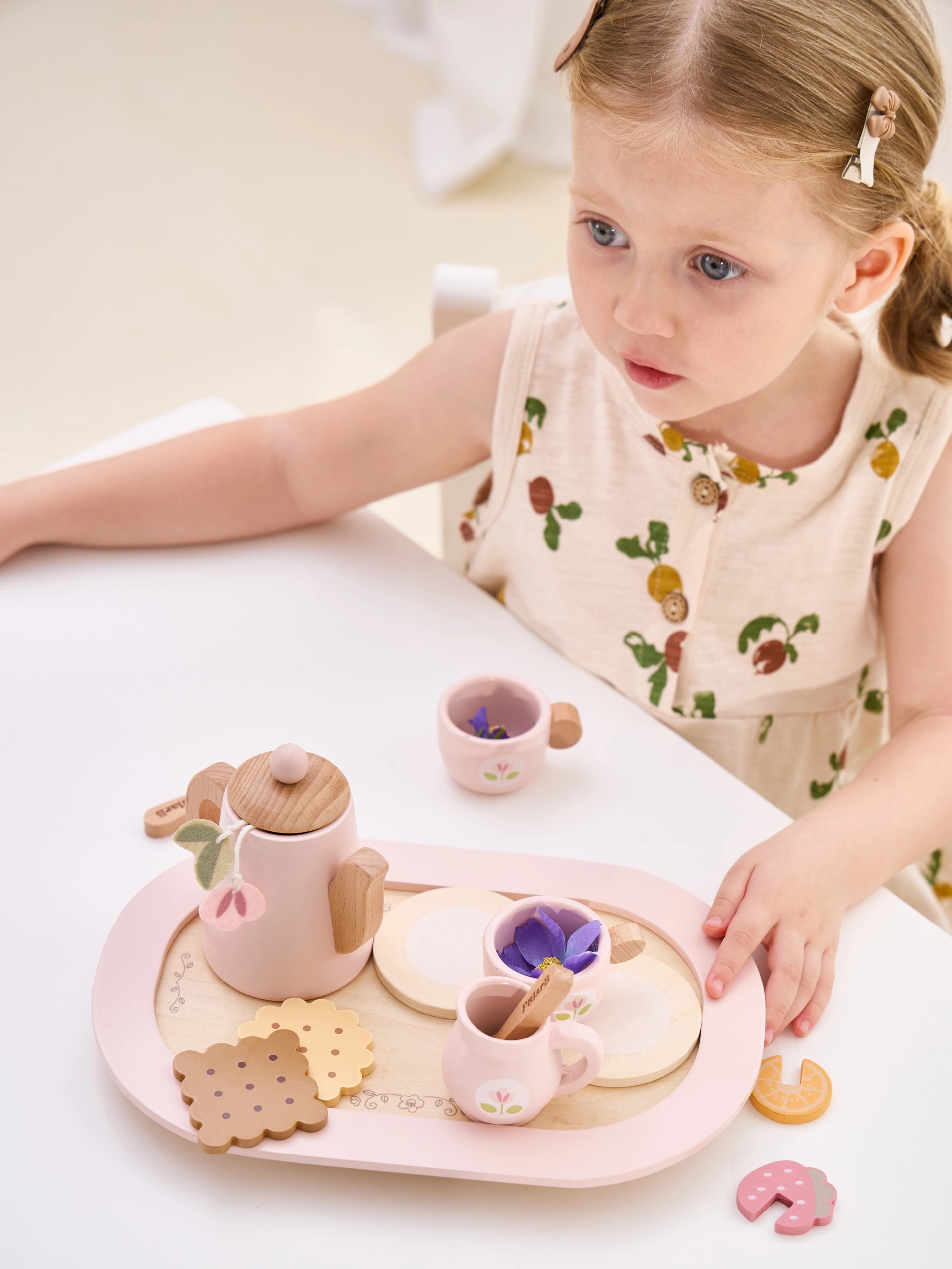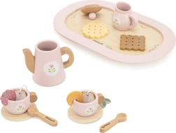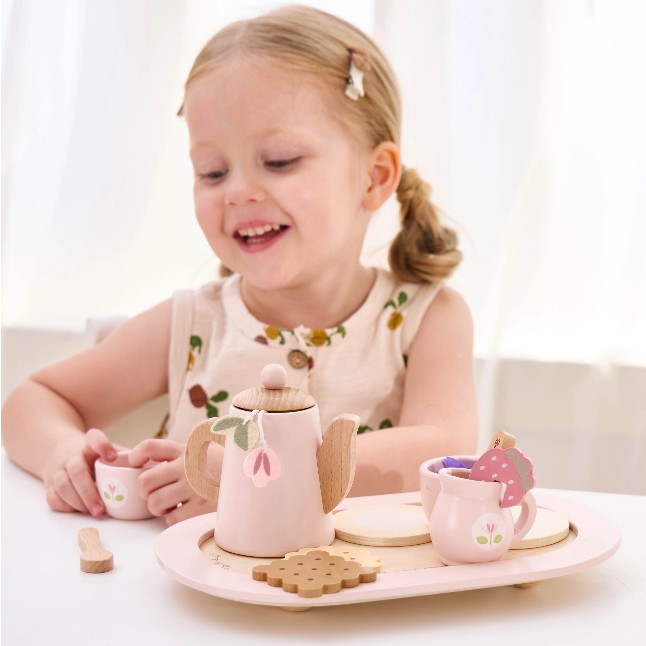Rinkinyje yra viskas, ko reikia serviravimui: arbatinukas su dangteliu, puodeliai su lėkštutėmis, pieno ąsotėlis, šaukšteliai, arbatos maišeliai, vaisių riekelės ir kvapnūs „sausainiai“ – visa tai ant praktiško padėklo. Dėl detalių sudėties tai puikus papildymas vaikų kambariui Montessori dvasia ir taip pat graži dovana, kuri pradžiugins kiekvieną mažą šeimininką.