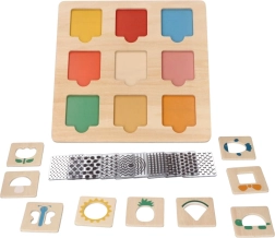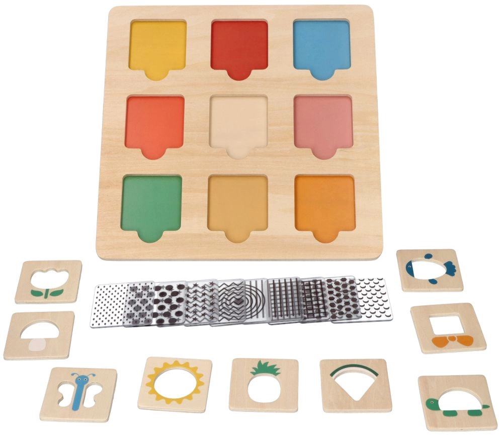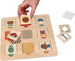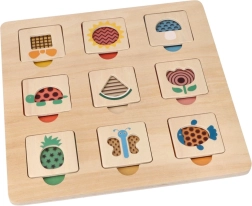 Išmanios ir smagios medinės dėlionės patiems mažiausiems padeda lavinti smulkiąją motoriką, spalvų, formų ir raštų atpažinimą bei treniruoja loginį mąstymą. 28 × 28 cm dydžio lenta su devyniais spalvingais elementais idealiai tinka vaikams nuo 12 mėn., o dėl saugaus medinio dizaino ir lygių kraštų yra puikus pasirinkimas pirmiesiems žaidimams ir mokymuisi.
