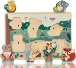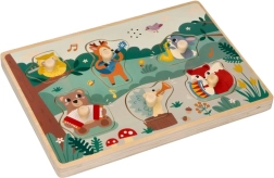 Ši medinė garso dėlionė su miško motyvu suteikia vaikams pirmąją pažintį su muzikos instrumentais žaismingu būdu. Kiekviena spalvinga detalė su gyvūnėliu turi patogų laikiklį lengvam suėmimui, o įdėjus į tinkamą vietą pasigirsta atitinkamas garsas, kuris skatina kartoti veiklą ir tyrinėti.