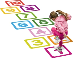 Šokinėjimas per sunumeruotus laukelius gerina smulkiąją ir stambiąją motoriką bei pusiausvyrą – tobulai tinka šokinėjimo žaidimui.