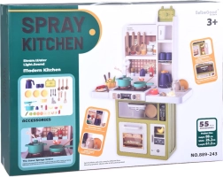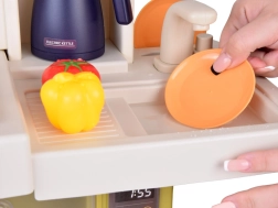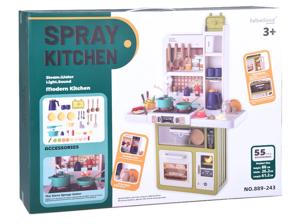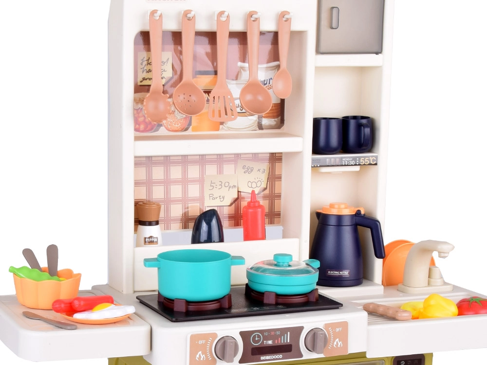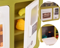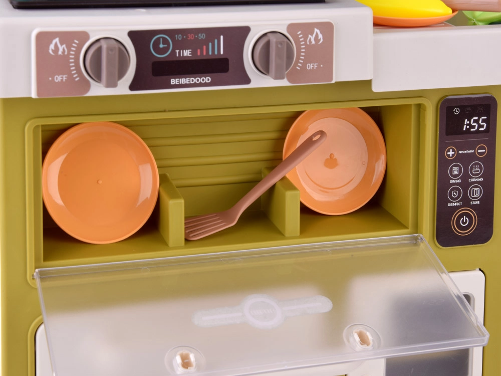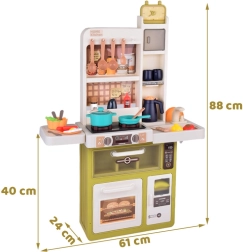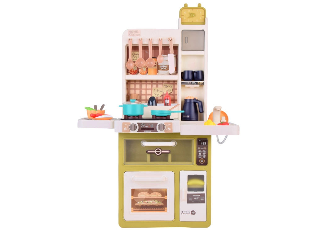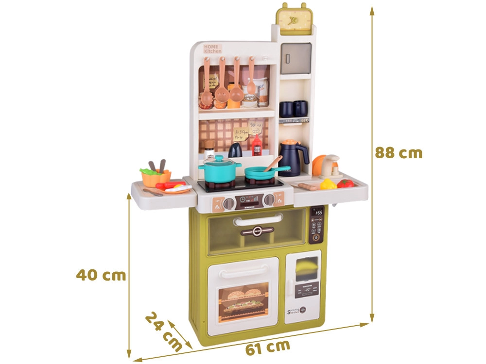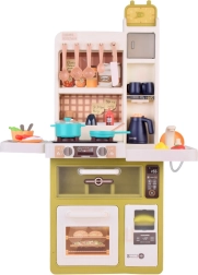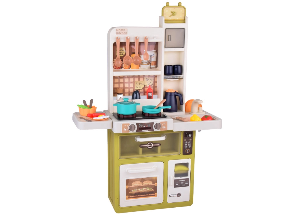 Interaktyvi vaikiška virtuvėlė kreminės žalios spalvos paverčia žaidimą virimu tikroviška patirtimi: ji siūlo tekantį vandenį, šviesos ir garso efektus, garų efektą ir 55 dalių priedus. Su atsidarančiu šaldytuvu, orkaite ir indaplove bei matmenimis 88×61×24 cm ji lavina kūrybiškumą, motoriką ir socialinius įgūdžius.