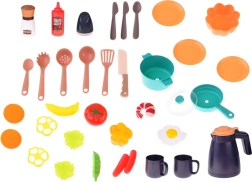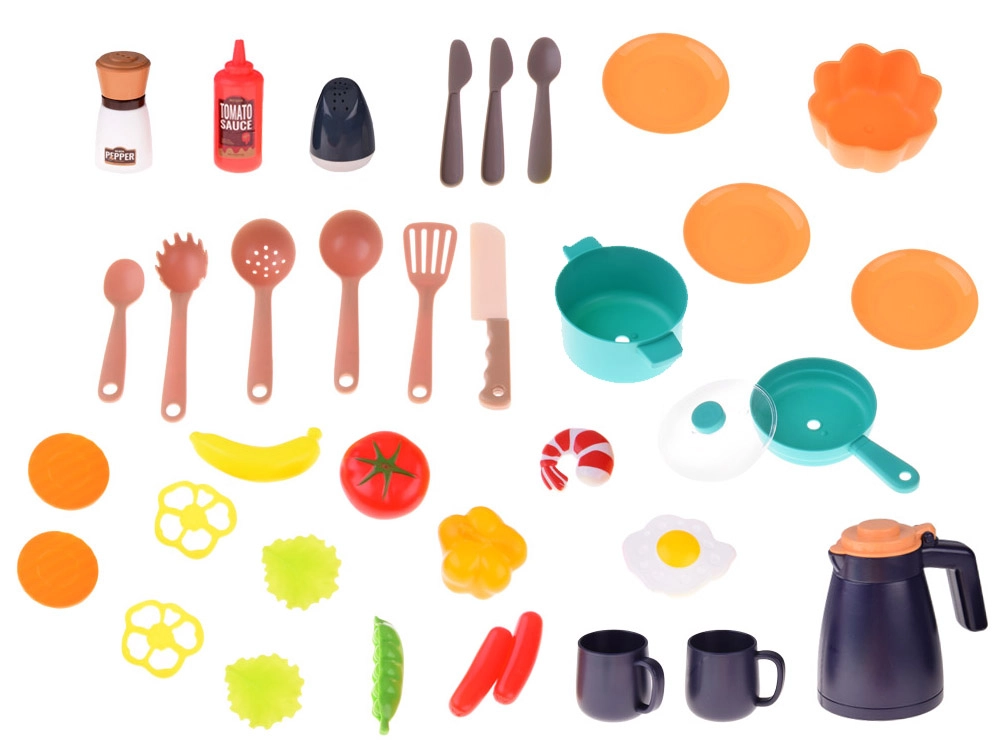 - 55 priedų rinkinys – puodai, arbatinukas, lėkštės, puodeliai, stalo įrankiai, prieskonių indeliai ir maisto maketai.