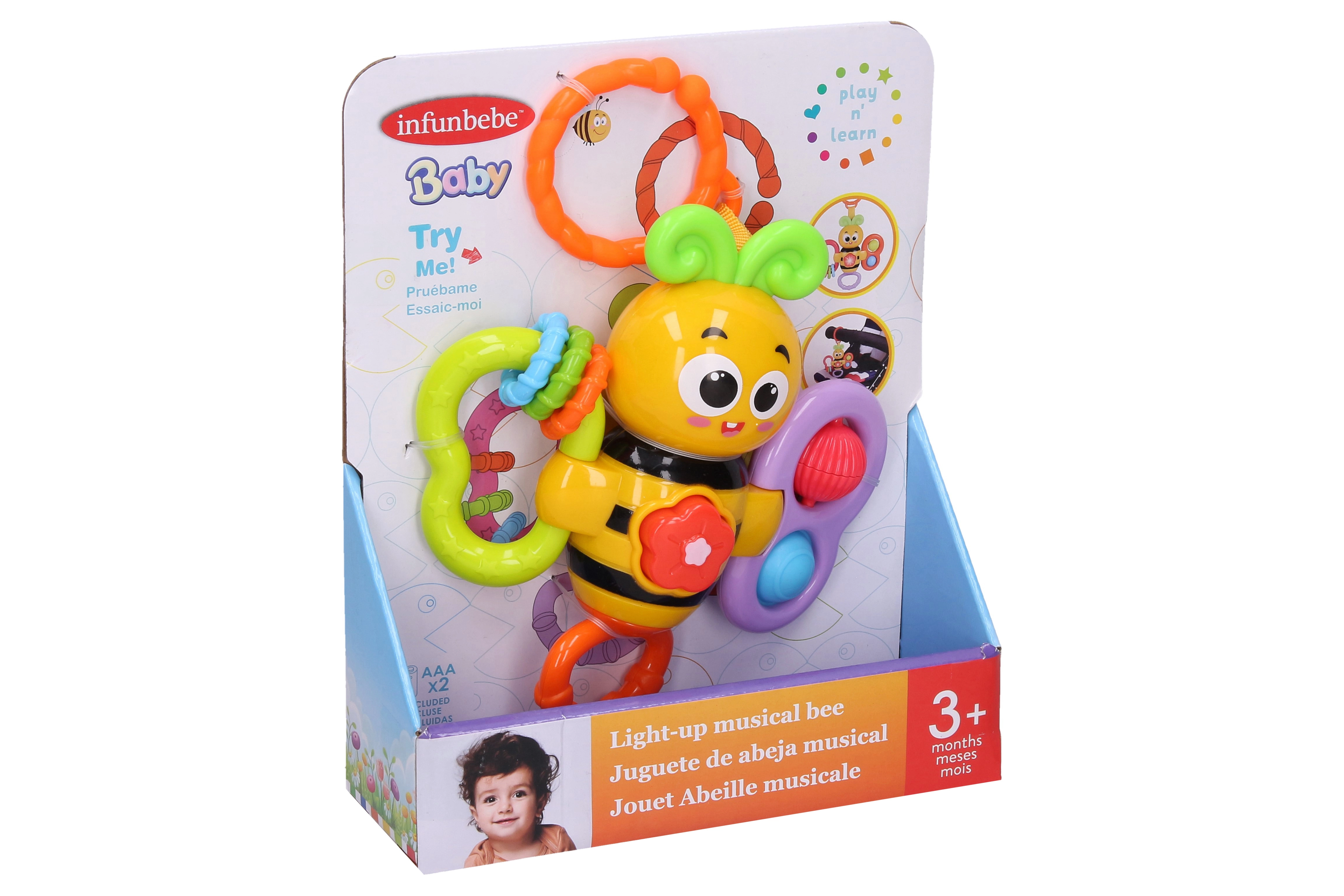Miela grojanti bitutė su praktišku segtuku pradžiugins vaikus melodingais garsais ir linksmais barškėjimais. Dėl kompaktiško 14 cm dydžio ją lengvai prisegsite prie vežimėlio, lovytės arba automobilinės kėdutės. Mygtukas melodijoms paleisti ir perjungti, barškantys elementai ir 2× AAA baterijos pakuotėje paverčia ją puikiu kelionių ir namų palydovu.
