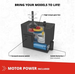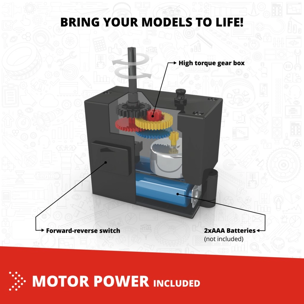 Rinkinyje yra variklis su judėjimo krypties nustatymu. Atgaivinkite savo modelius ir leiskite jiems važiuoti ar judėti.