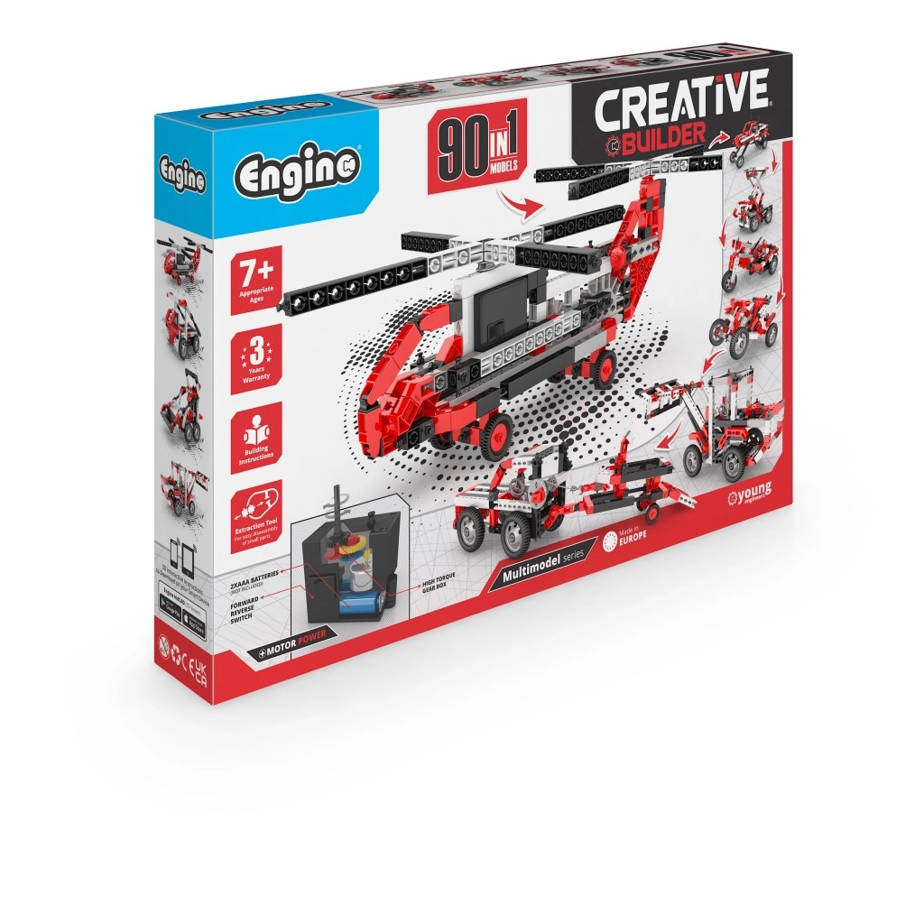 Atraskite begalines konstravimo galimybes su ENGINO Creative Builder 90 viename rinkiniu ir varikliu modelių pavarai. Iš vieno rinkinio galite surinkti net 90 skirtingų modelių – nuo automobilių ir motociklų iki lėktuvų ir sraigtasparnių. Naudodamiesi interaktyvia programėle kidCAD 3D galėsite modelius sukti, priartinti ir mokytis žingsnis po žingsnio. Tinka nuo 7 metų, suderinama su kitais ENGINO rinkiniais.