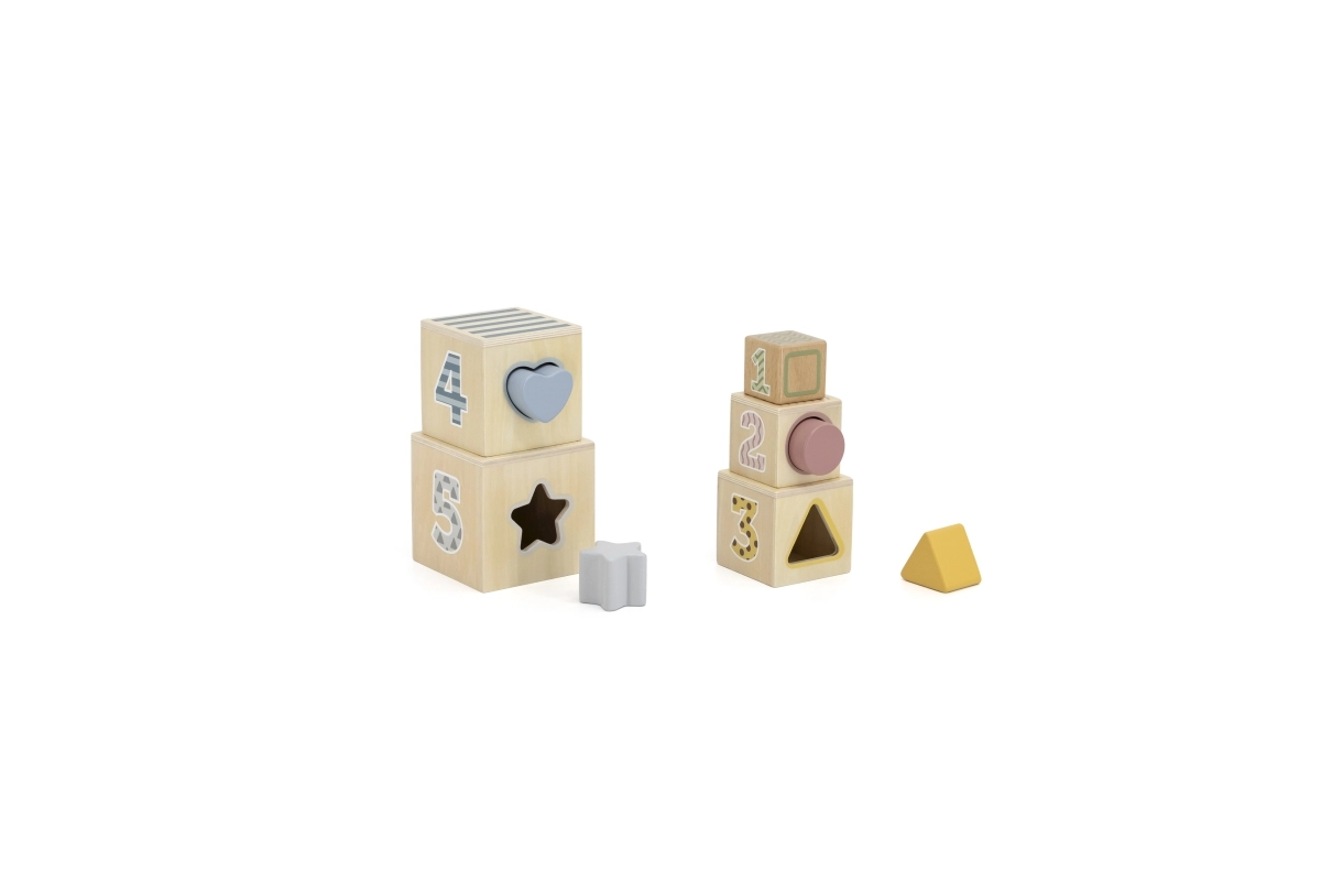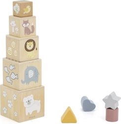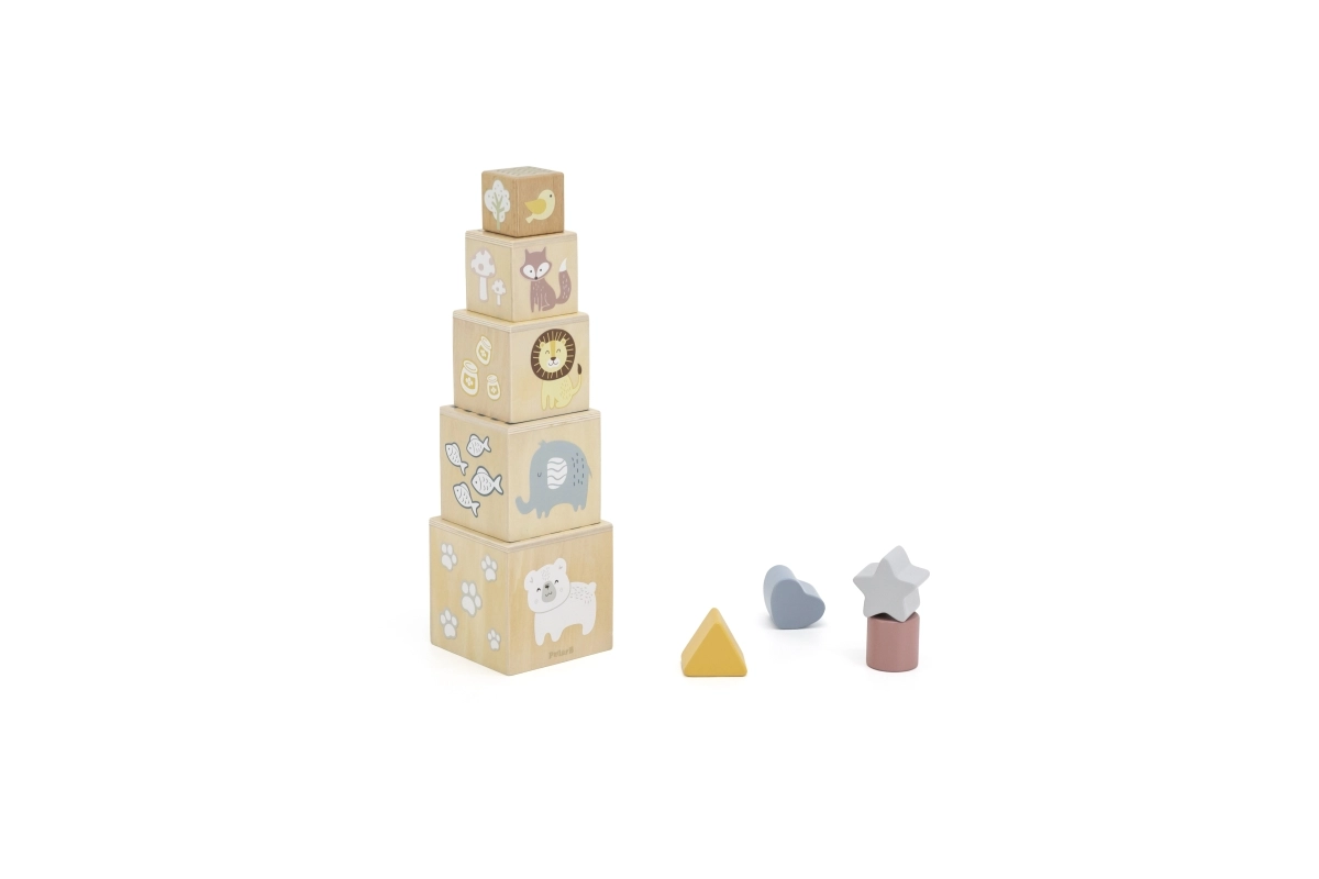Penkių kaladėlių bokštas ir atitinkančios formos padeda vaikams suprasti dydžius, skaičius ir erdvinį suvokimą. Rinkinys lavina loginį mąstymą ir smulkiąją motoriką.