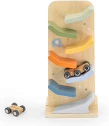 Spalvota rampų trasa su automobiliuku skatina kartoti žaidimą, stiprina pastabumą, koordinaciją ir priežasties–pasekmės supratimą.