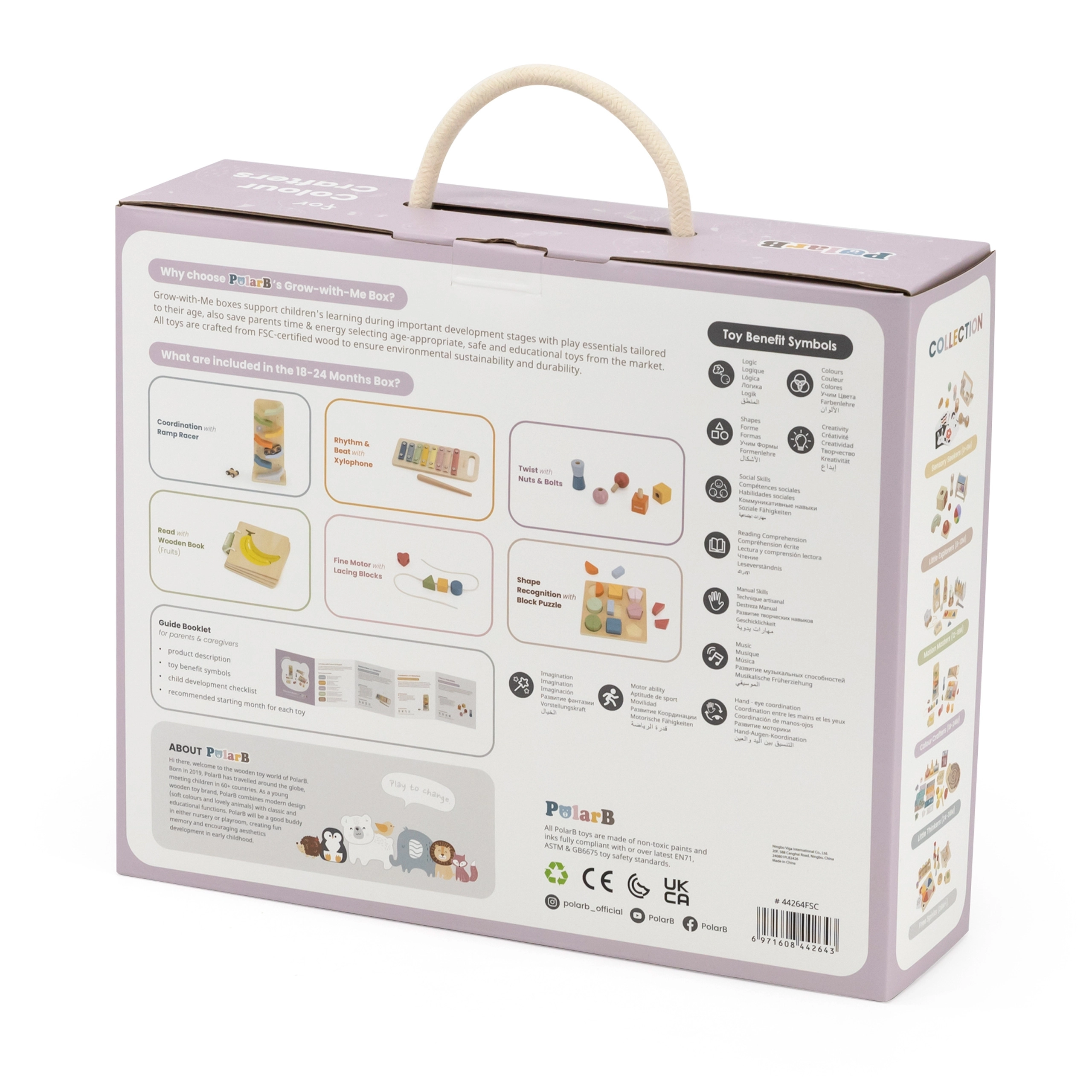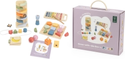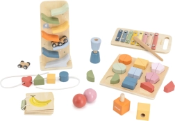 Šis kruopščiai sudarytas VIGA rinkinys 18–24 mėn. amžiaus vaikams jungia pamėgtus medinius žaislus į darnų visumą. Jame rasite ksilofoną pirmiesiems muzikiniams bandymams, linksmą automobiliukų trasą, formų dėlionę, srieginius elementus, veriamas figūras ir medinę knygelę su vaisių paveikslėliais. Kiekvienas elementas sukurtas taip, kad skatintų natūralią vaiko raidą per žaidimą.