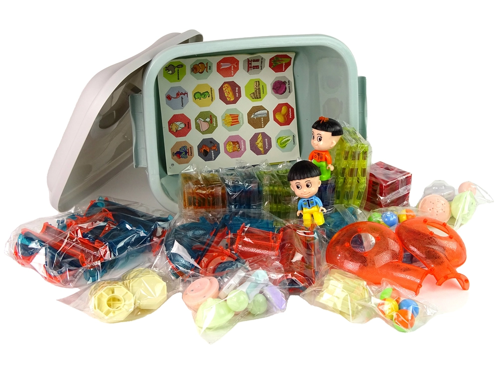 - 150 dalių, įskaitant šviečiančius rutuliukus, magnetinius kaladėlius, figūrėles (2 vnt.) ir lipdukus