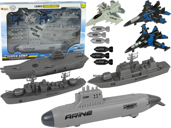 Pilnas rinkinys mažajam strategui atneša veiksmo kupinas jūrų kovas: povandeninis laivas su šaudyklu, karo laivai, 3 naikintuvai ir 9 bombos. Patvarus plastikas, realistiškos detalės ir CE sertifikatas užtikrina saugų žaidimą vaikams nuo 3 metų.