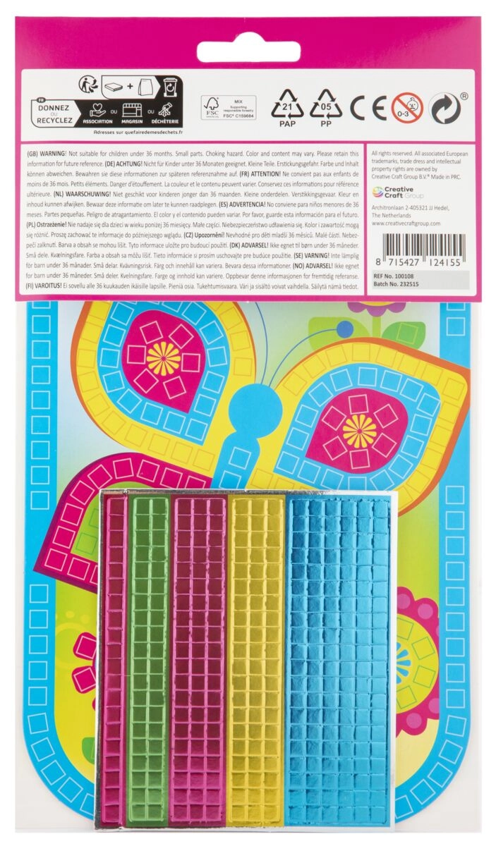 Šiame kūrybiniame rinkinyje rasite viską, ko reikia ryškiai mozaikai su drugelio motyvu sukurti. Tiesiog sekite spalvinius žymėjimus schemoje ir pamažu klijuokite metalinius putplasčio kvadratėlius į tinkamas vietas. Rezultatas – žėrintis A5 formato paveikslėlis, pradžiuginsiantis mažus kūrėjus ir tėvus.