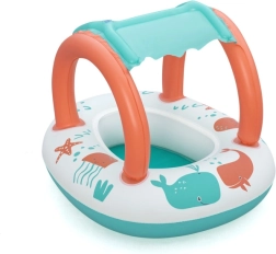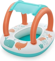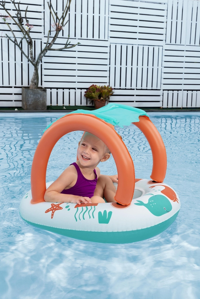 Lengva ir patogi valtis patiems mažiausiems sujungia linksmą jūrinę grafiką su praktišku stogeliu, turinčiu UV apsaugą. Nuimamas saulės stogelis tvirtinamas lipnia juosta, todėl lengvai pritaikysite pagal orą ir saulės intensyvumą. Uždaras sėdėjimo plotas su angomis kojytėms leidžia vaikams mėgautis stabiliu ir saugiu žaidimu vandenyje.